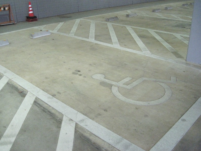 障害者等用駐車スペースの案内表示がある敷地内通路