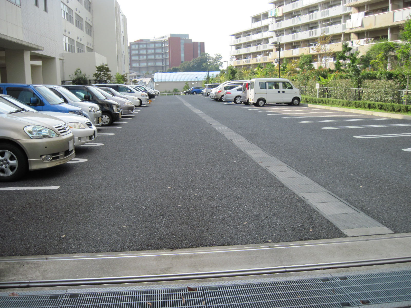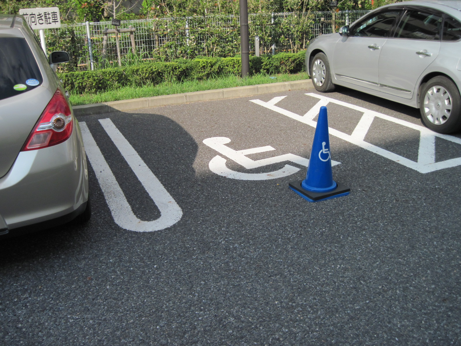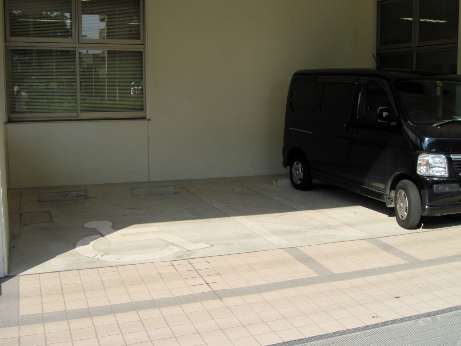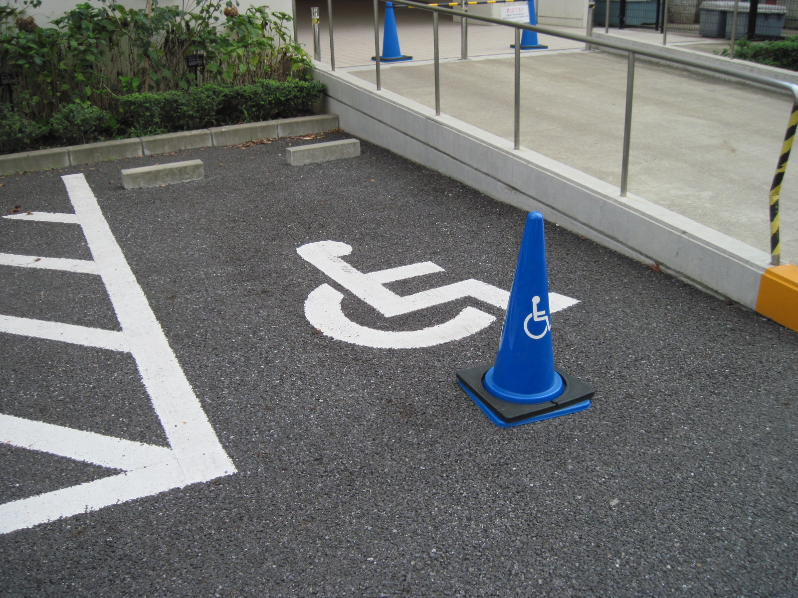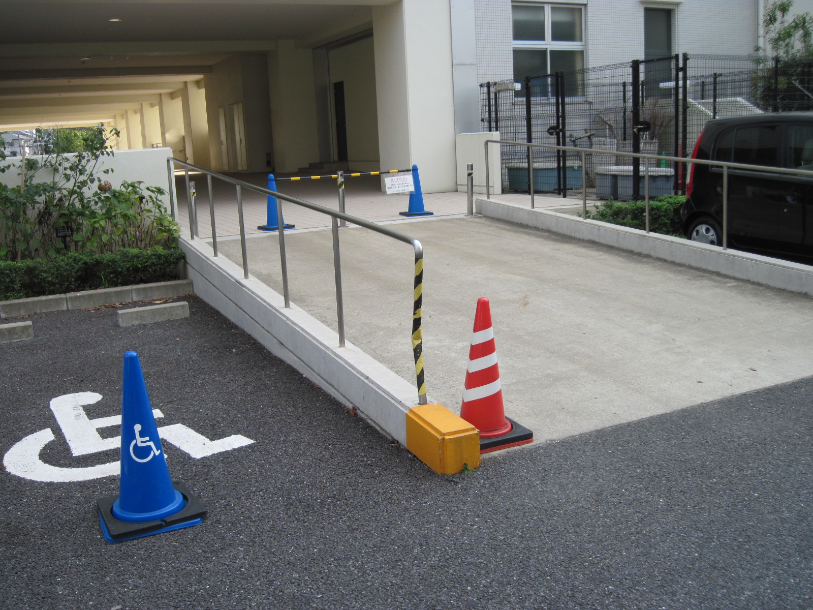 障害者等用駐車スペースの案内表示がある敷地内通路
