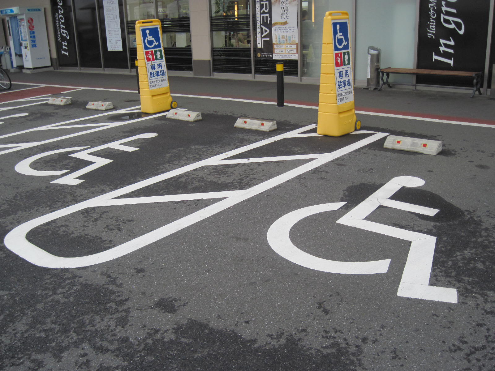 障害者等用駐車スペースの案内表示がある敷地内通路
