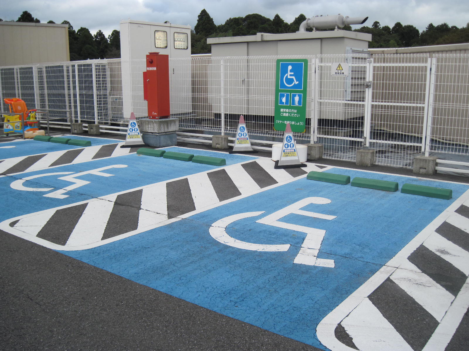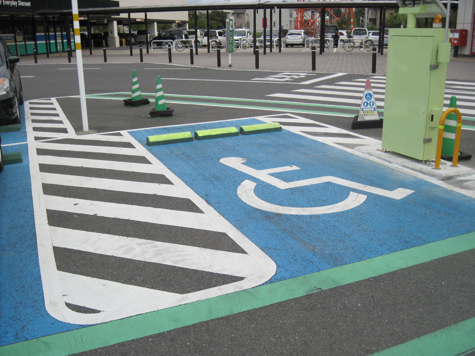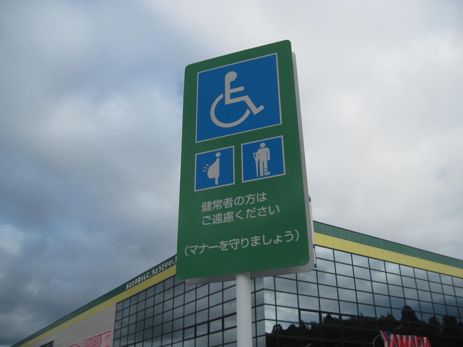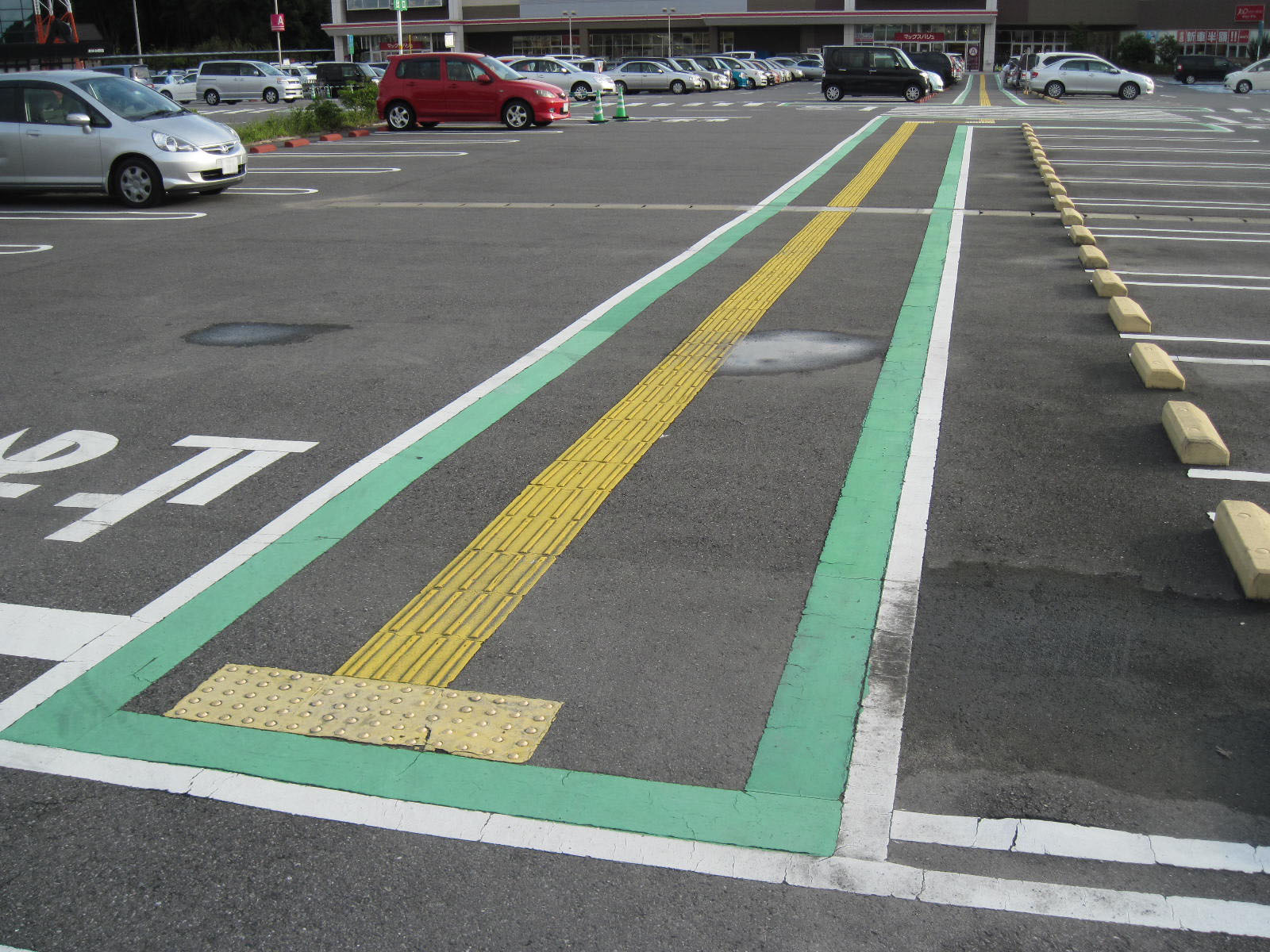 障害者等用駐車スペースの案内表示がある敷地内通路