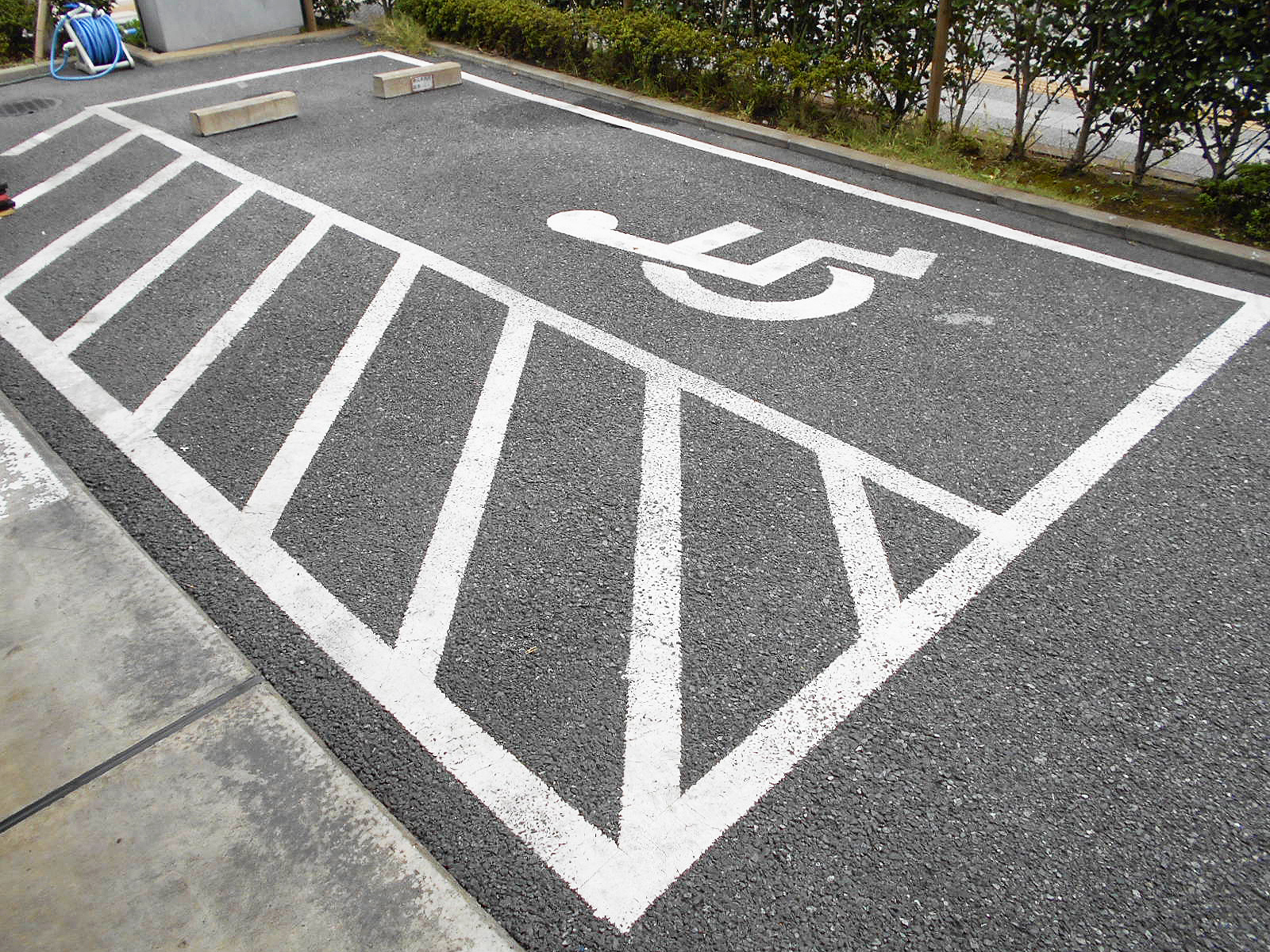 障害者等用駐車スペースの案内表示がある敷地内通路