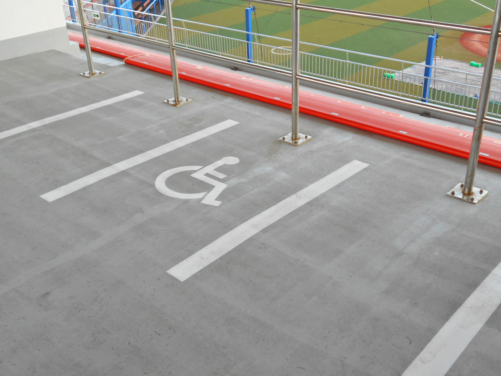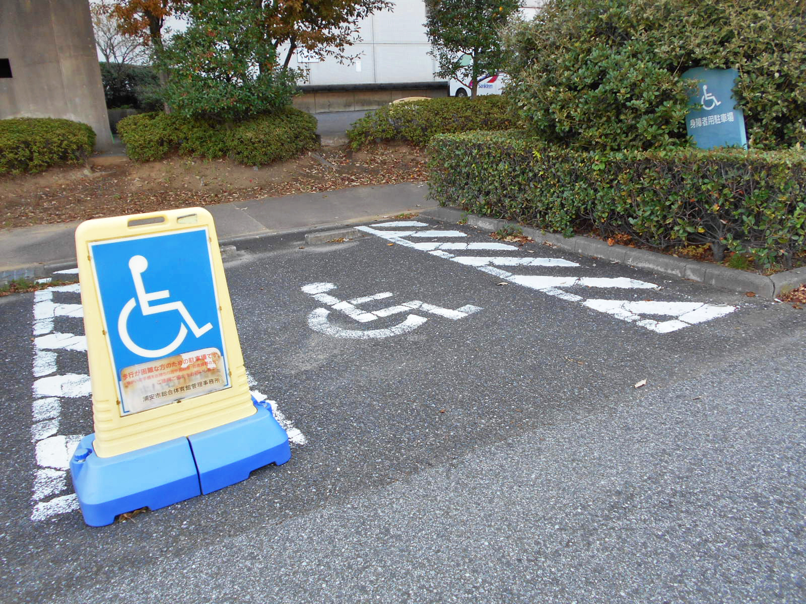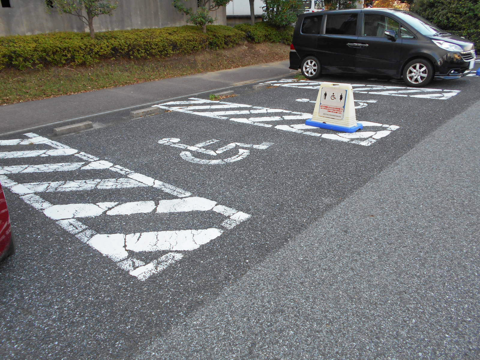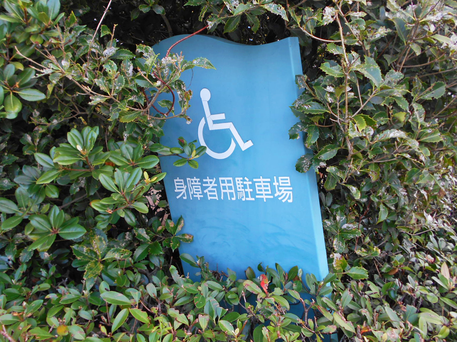障害者等用駐車スペースの案内表示がある敷地内通路