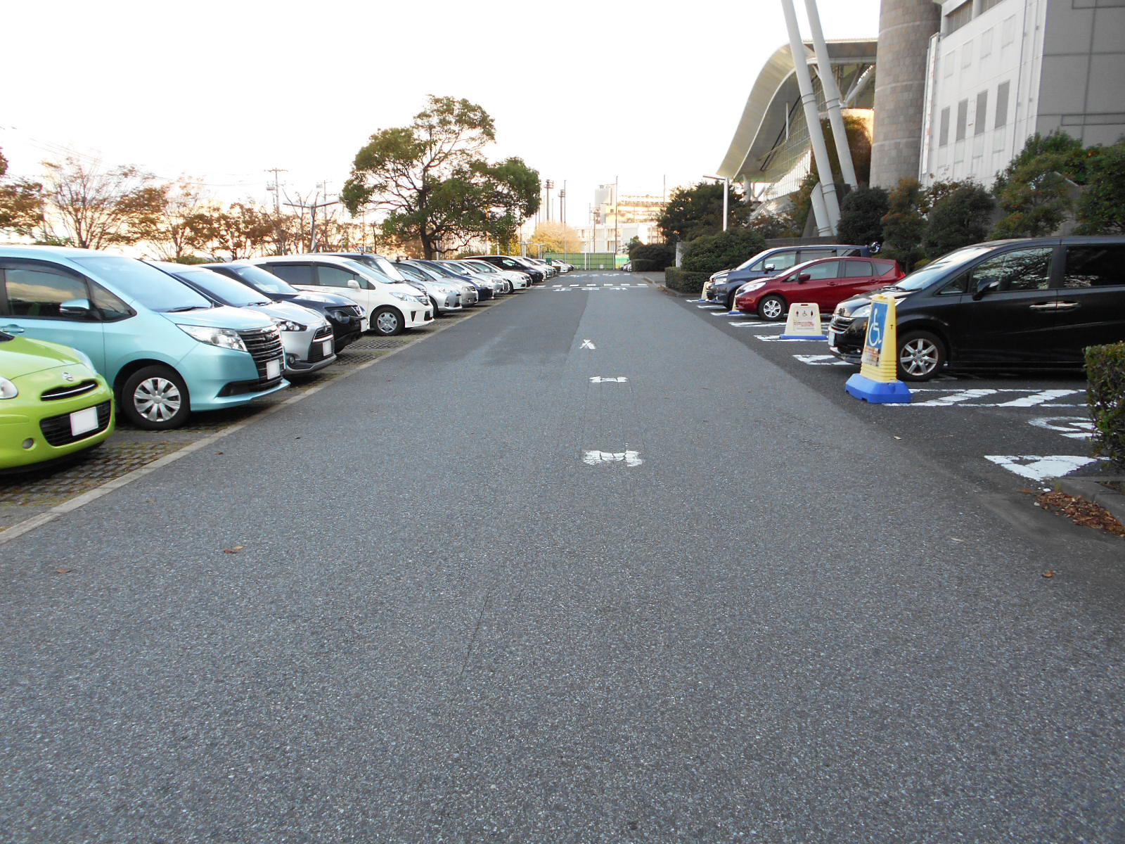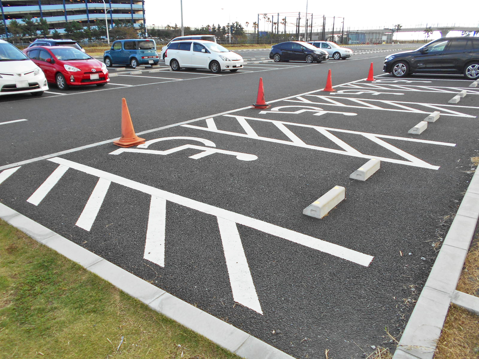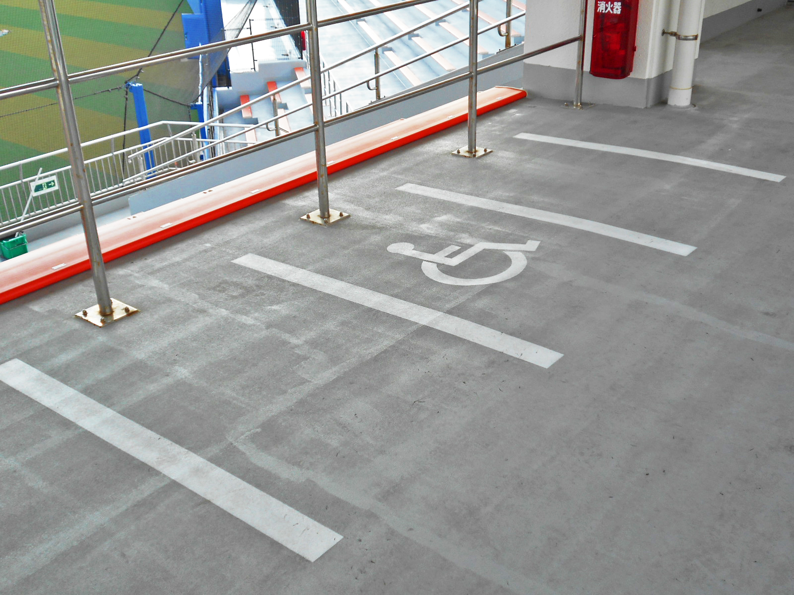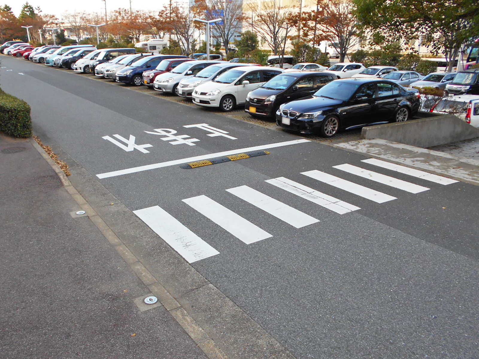 障害者等用駐車スペースの案内表示がある敷地内通路