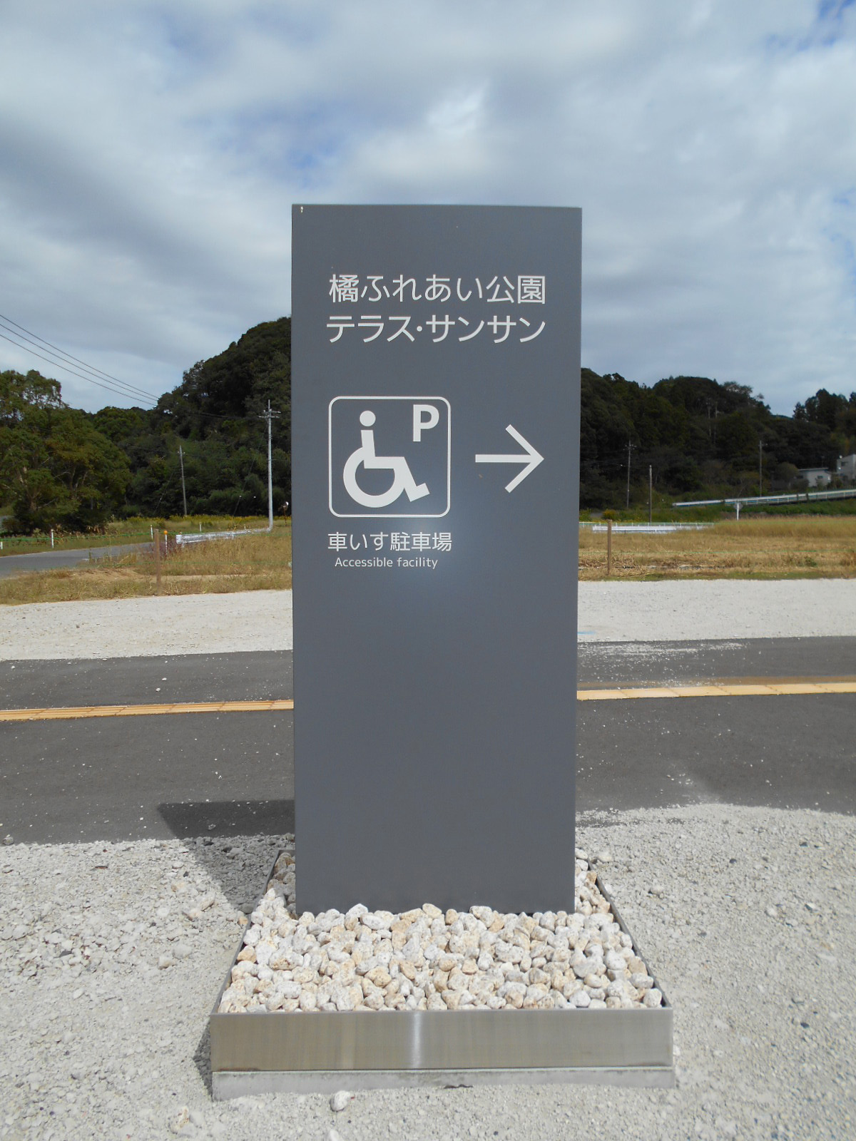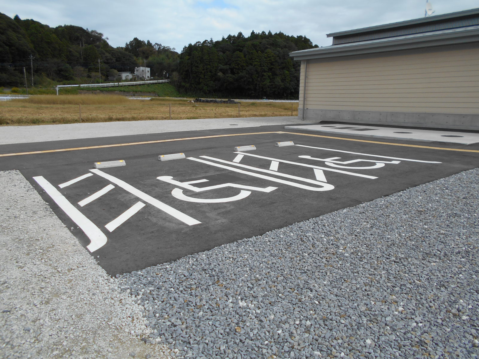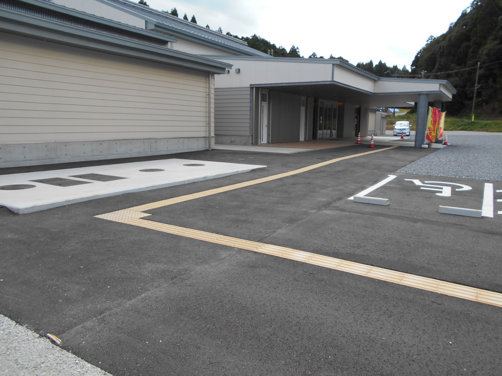 障害者等用駐車スペースの案内表示がある敷地内通路