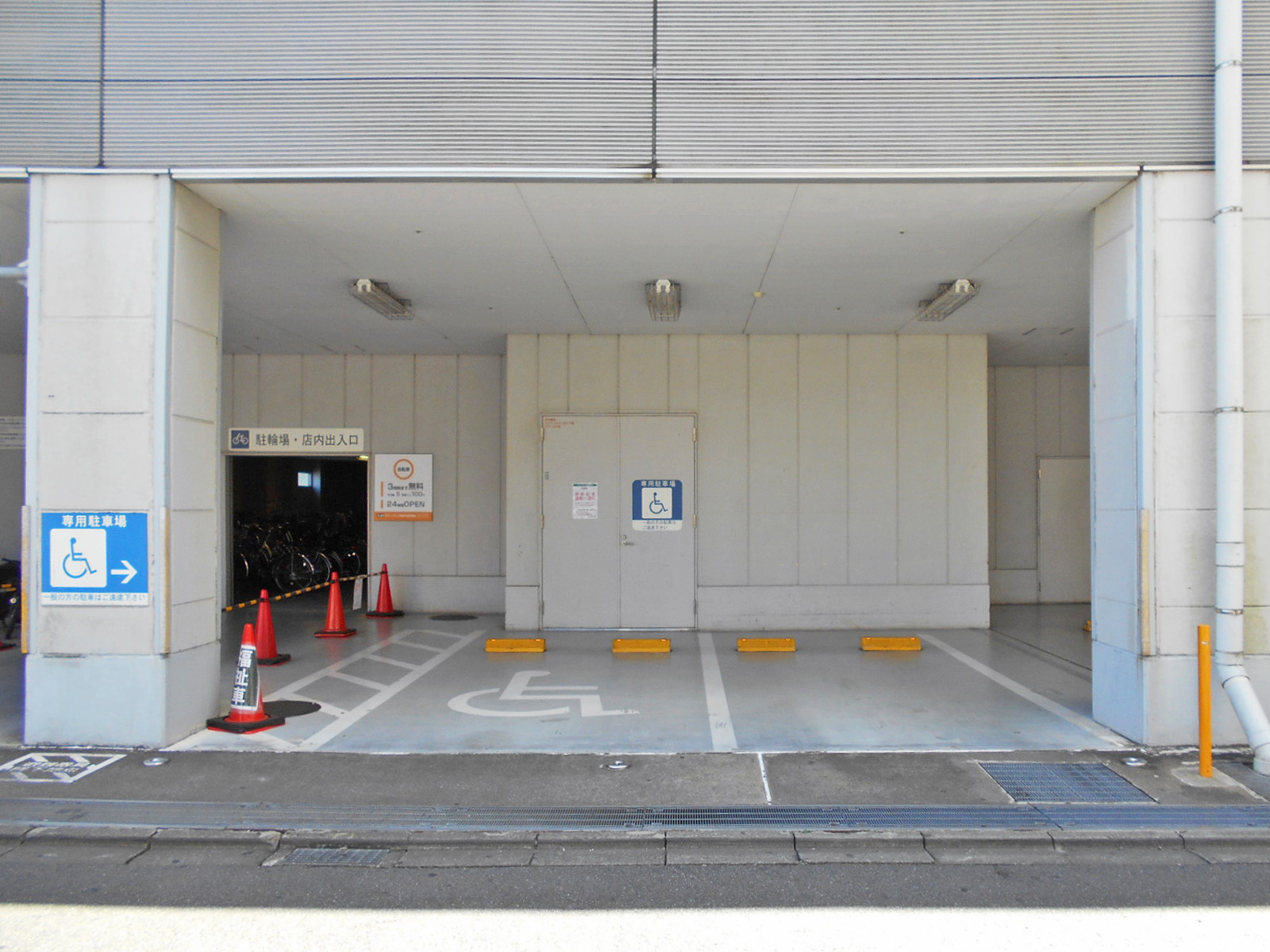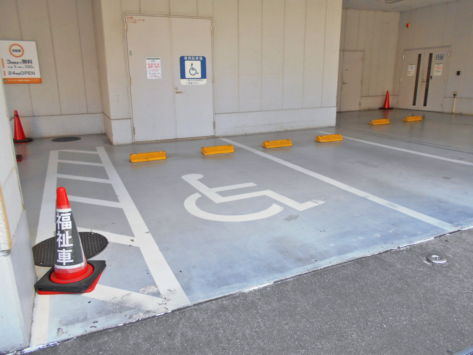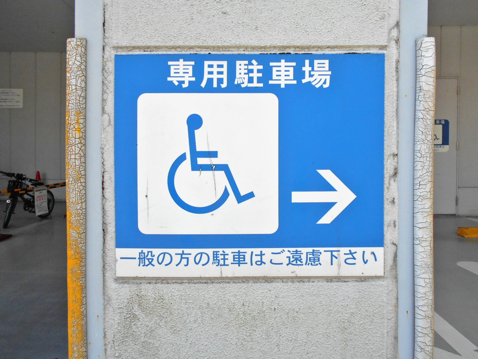 障害者等用駐車スペースの案内表示がある敷地内通路