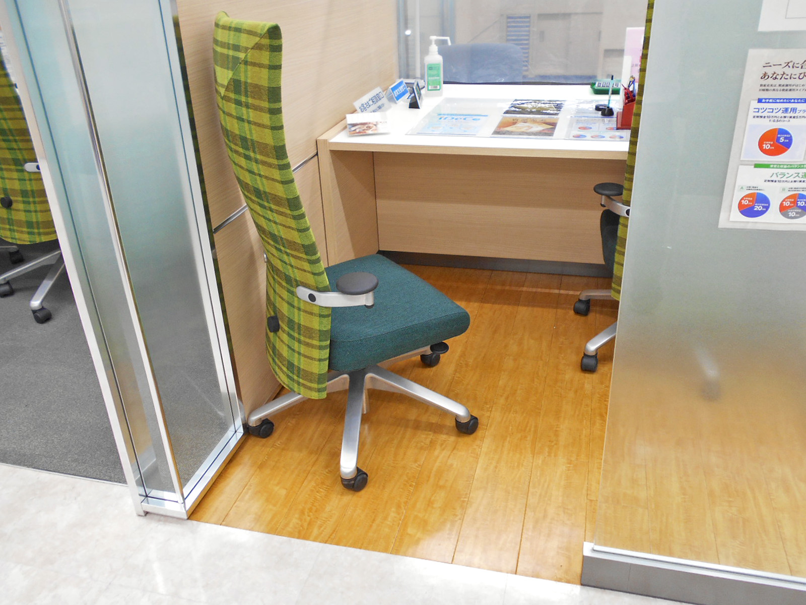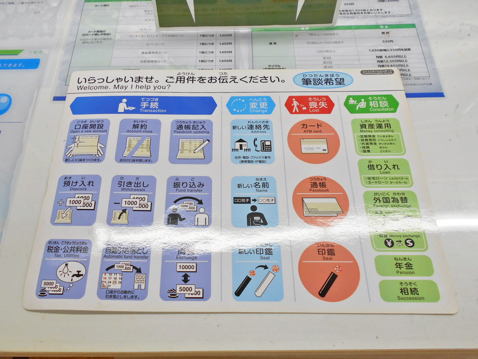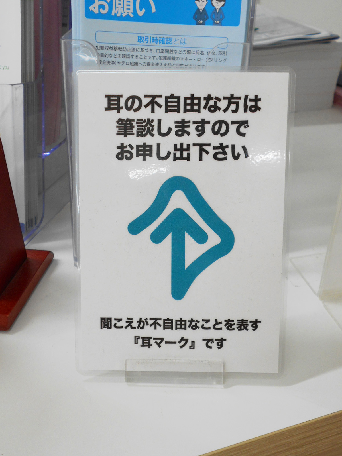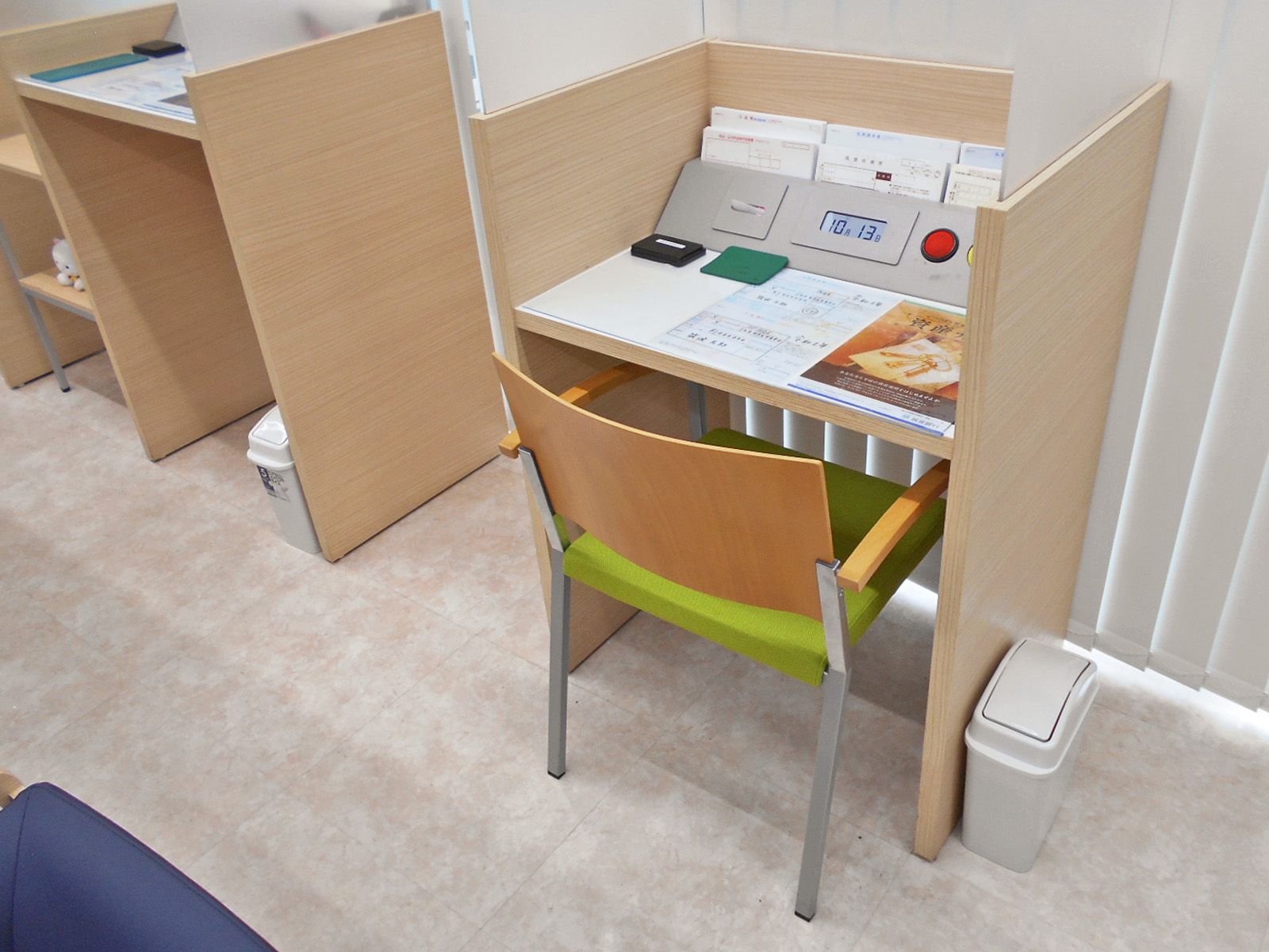 ローカウンター、コミュニケーションボード、低い記載台、窓口カウンターに荷物置きあり
