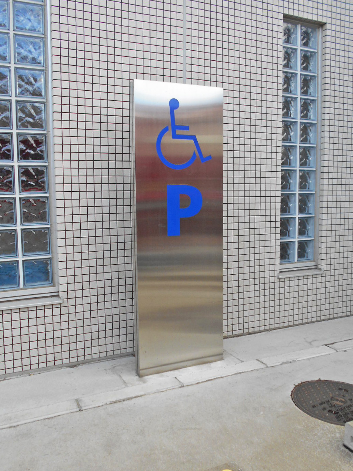 障害者等用駐車スペースの案内表示がある敷地内通路