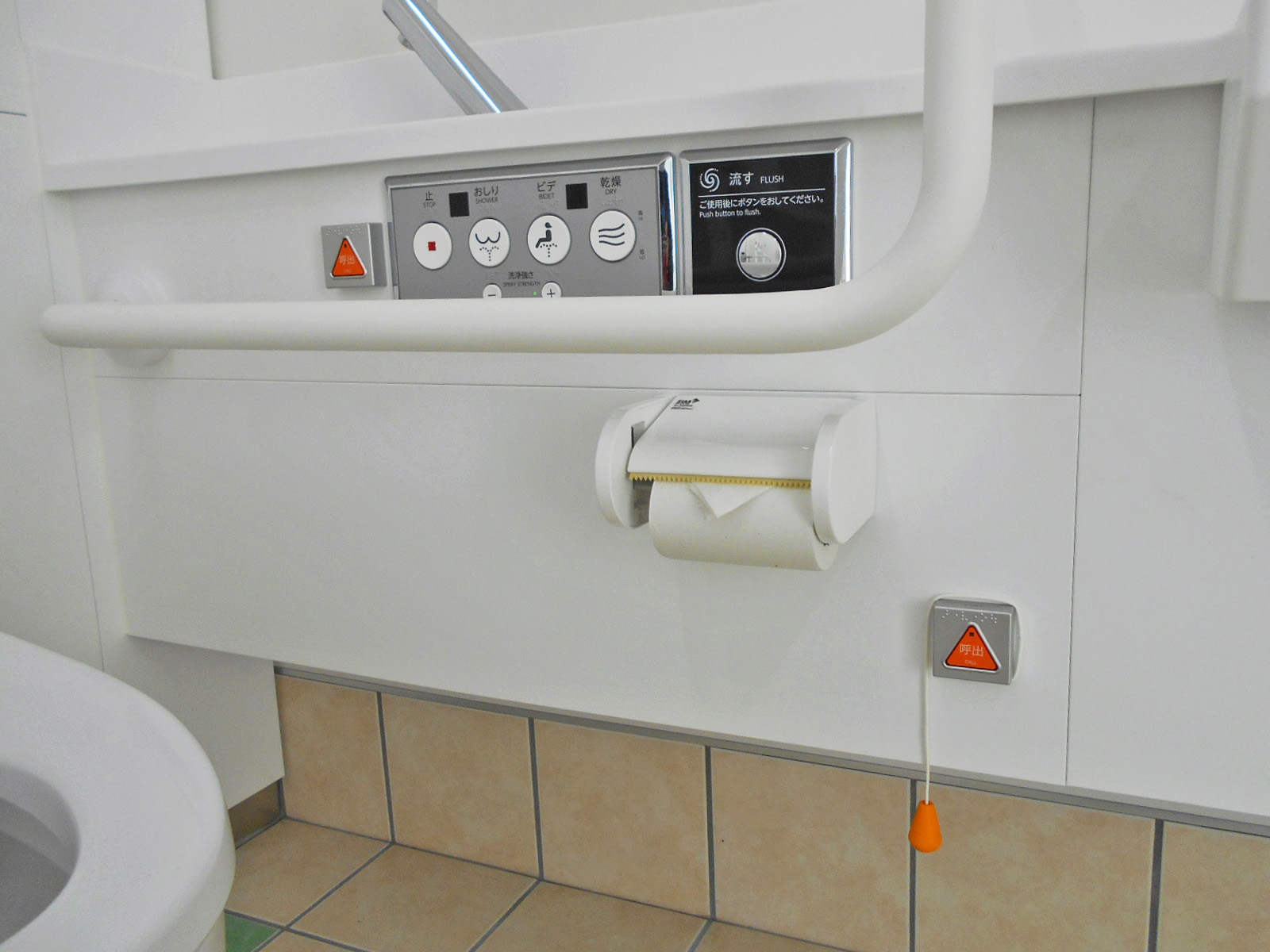 非常ベルが便座から手が届く範囲にある