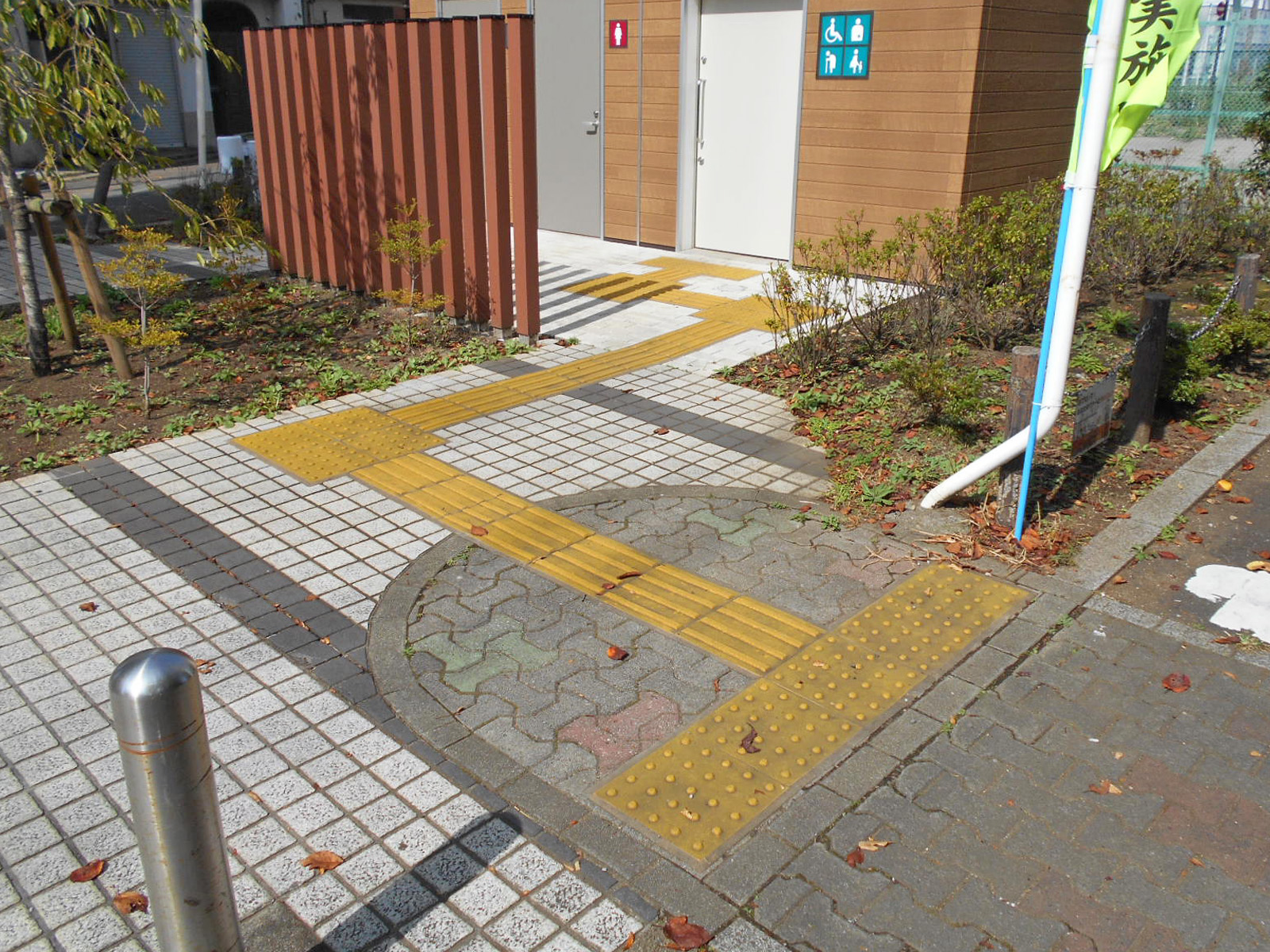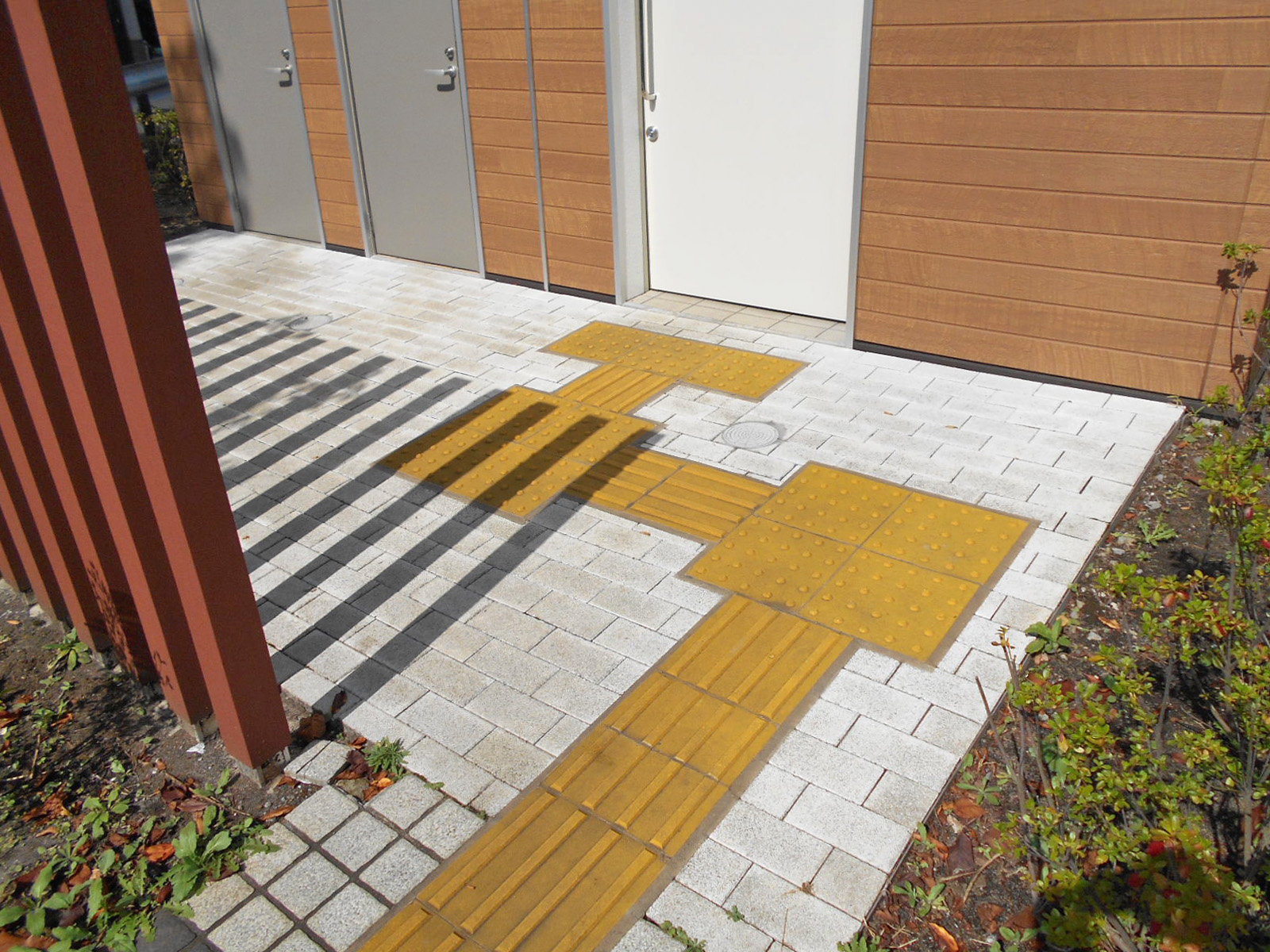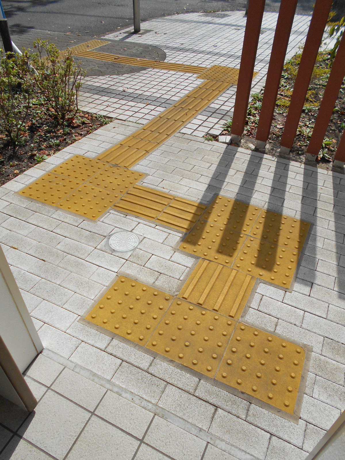 歩道から出入口までに視覚障害者誘導用ブロックがある