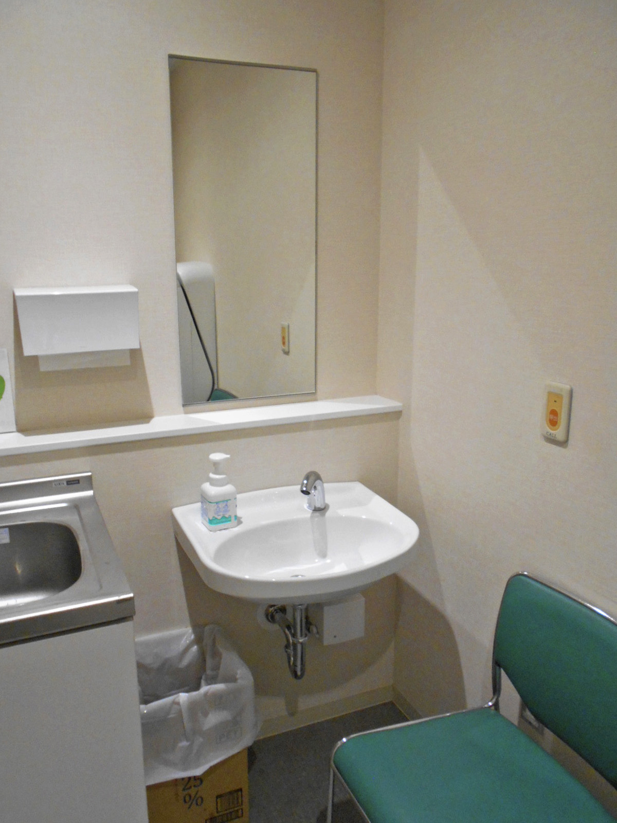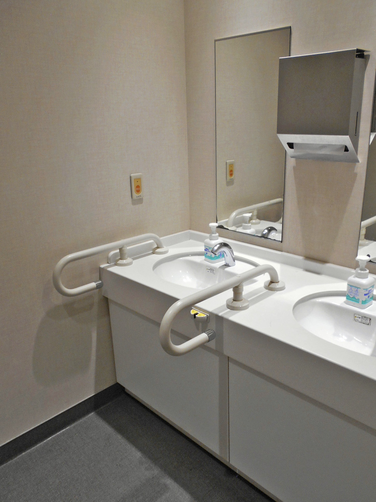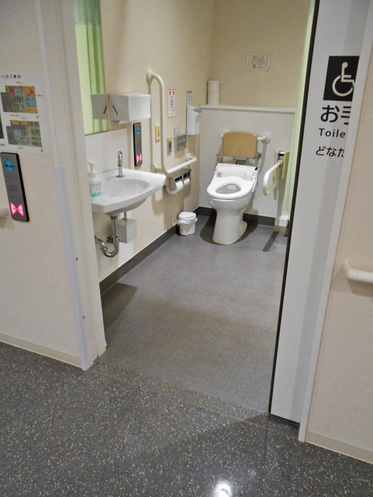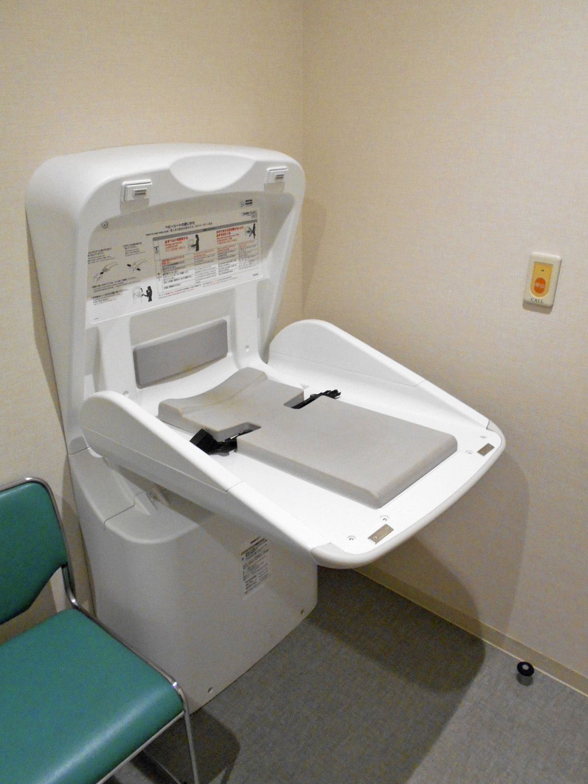 - ベビーベッドはおむつ交換台で対応、一般用トイレにも非常用押ボタンあり