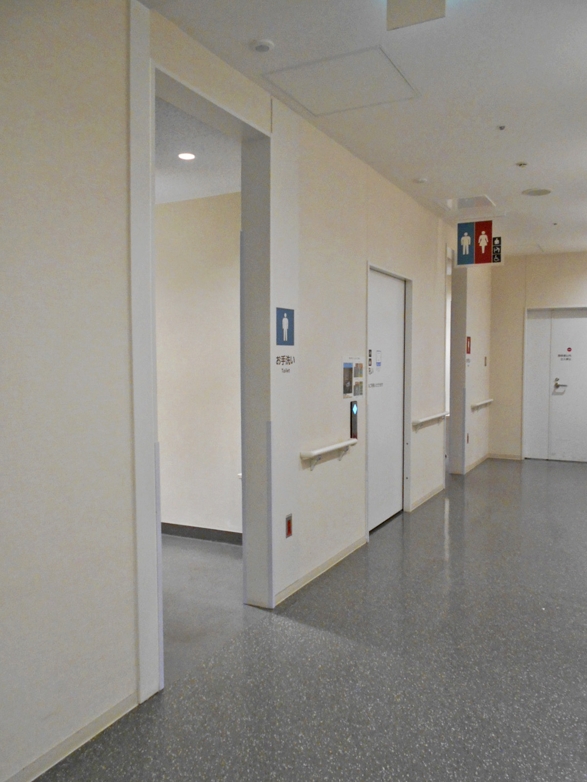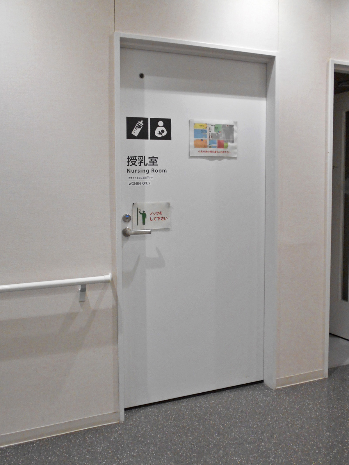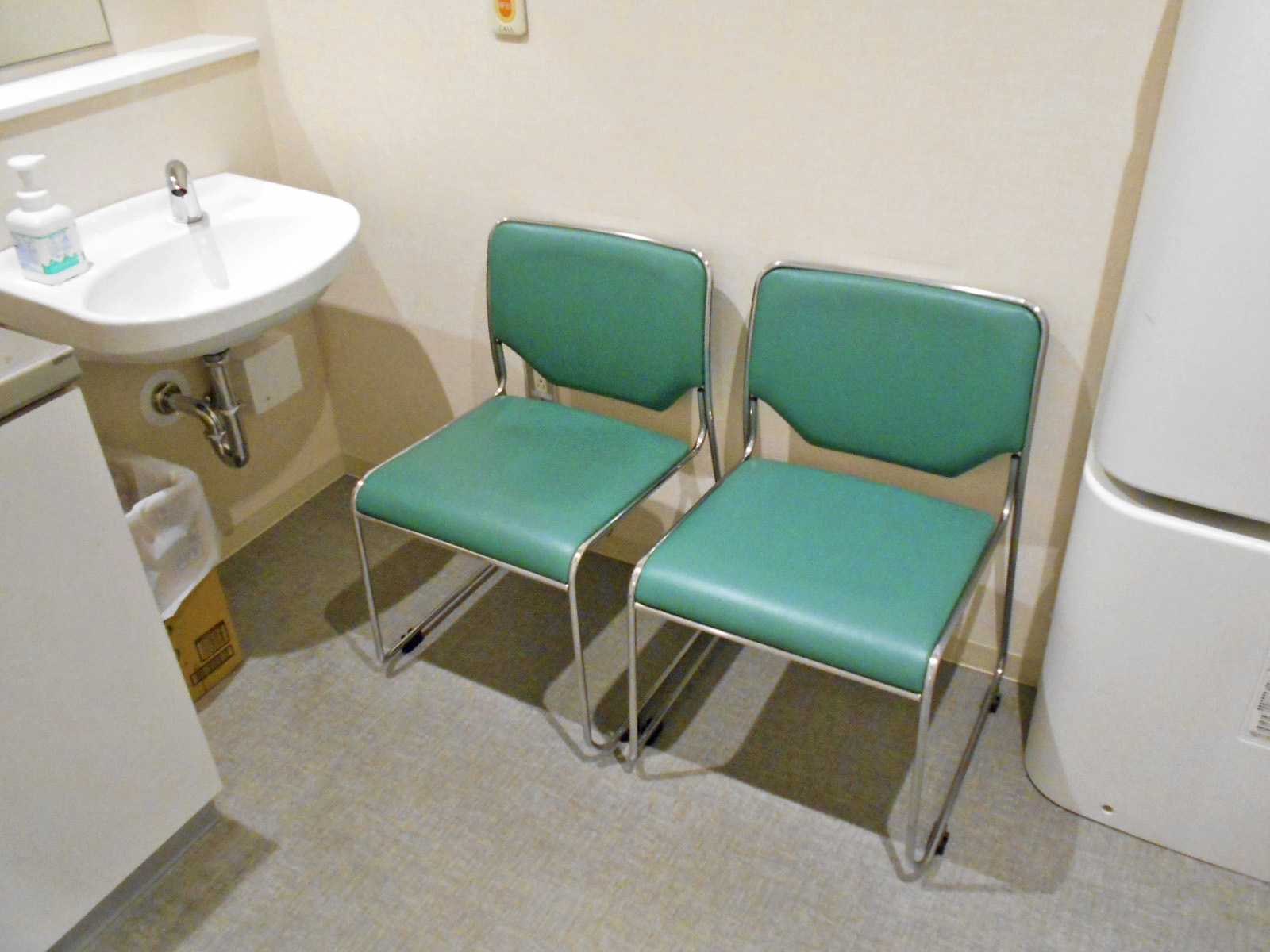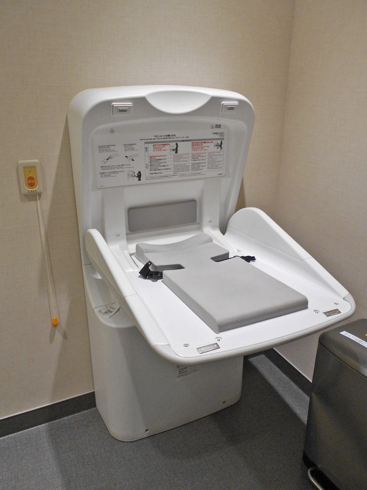 - ベビーベッドはおむつ交換台で対応、一般用トイレにも非常用押ボタンあり
