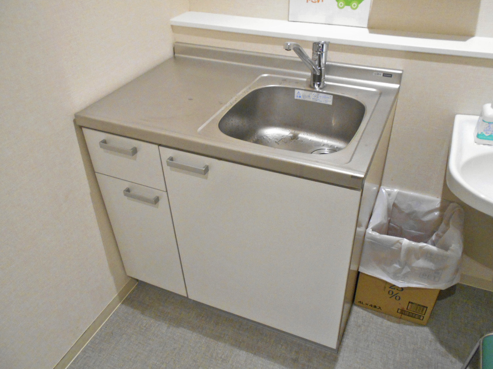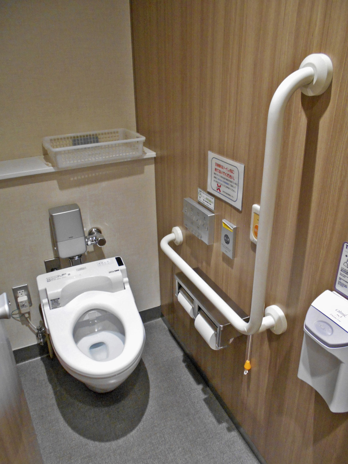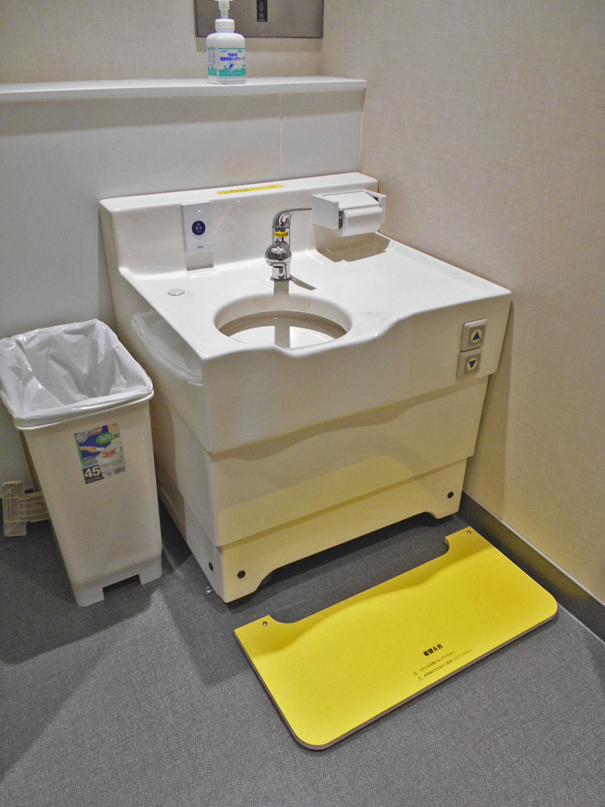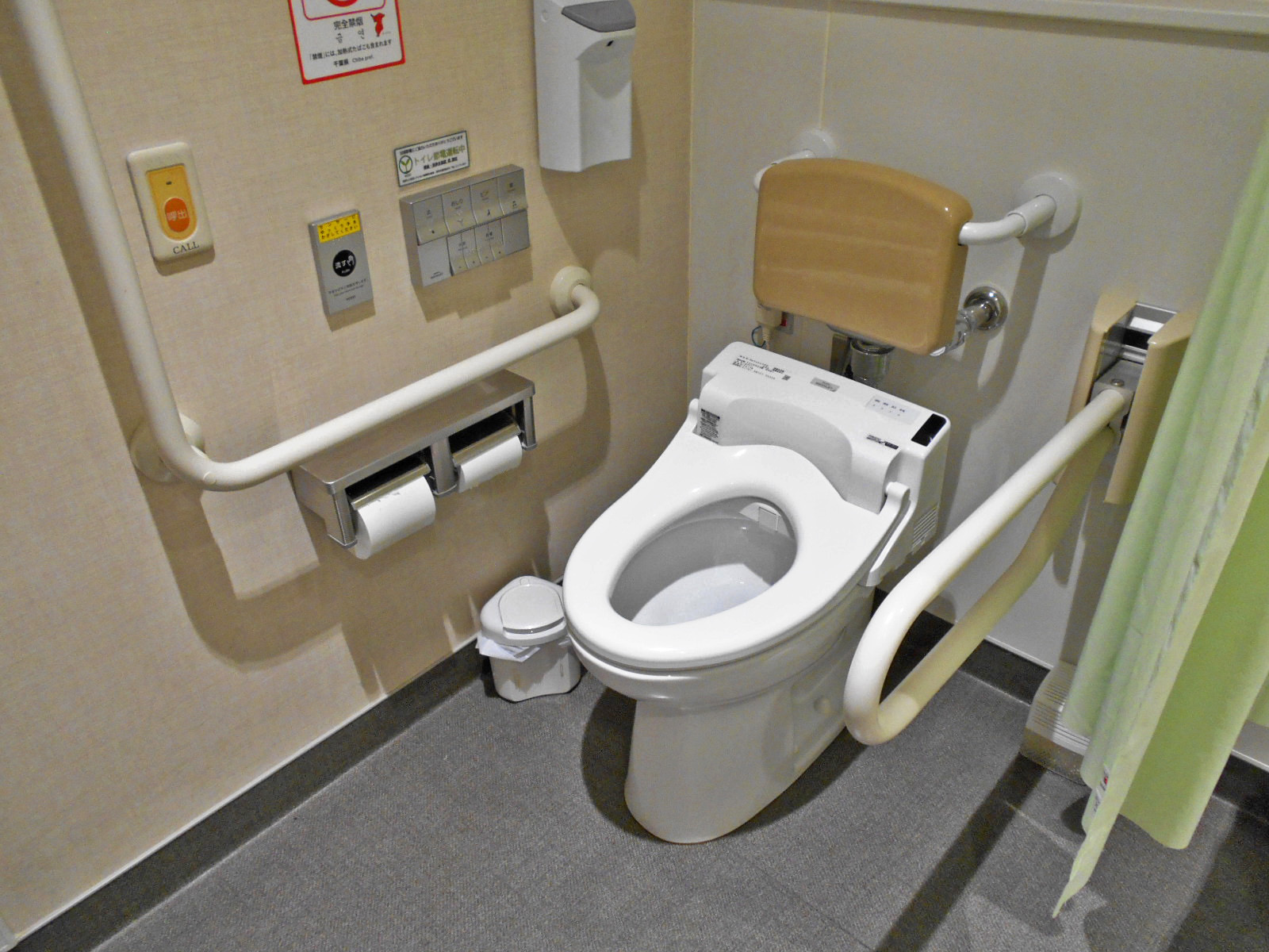 - ベビーベッドはおむつ交換台で対応、一般用トイレにも非常用押ボタンあり