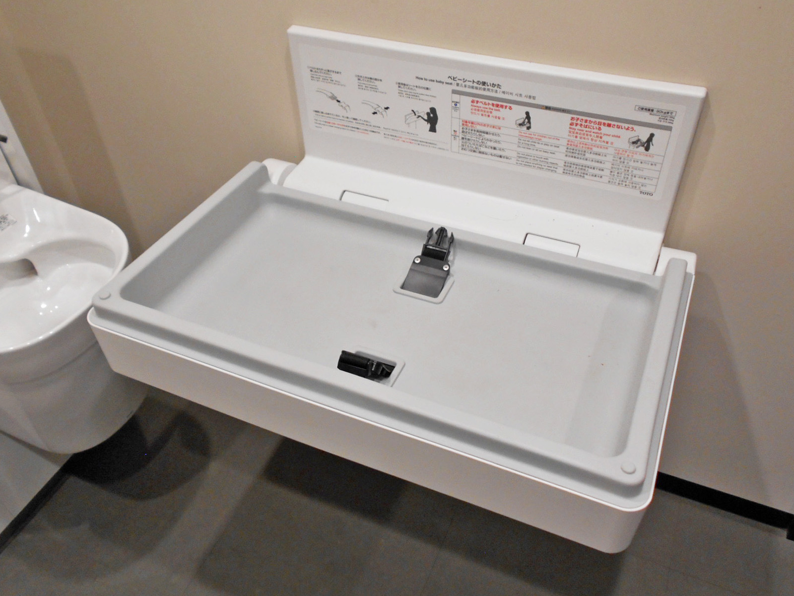 多目的トイレのベビーベッドはベビーシートで対応、一般用トイレにベビーチェアあり