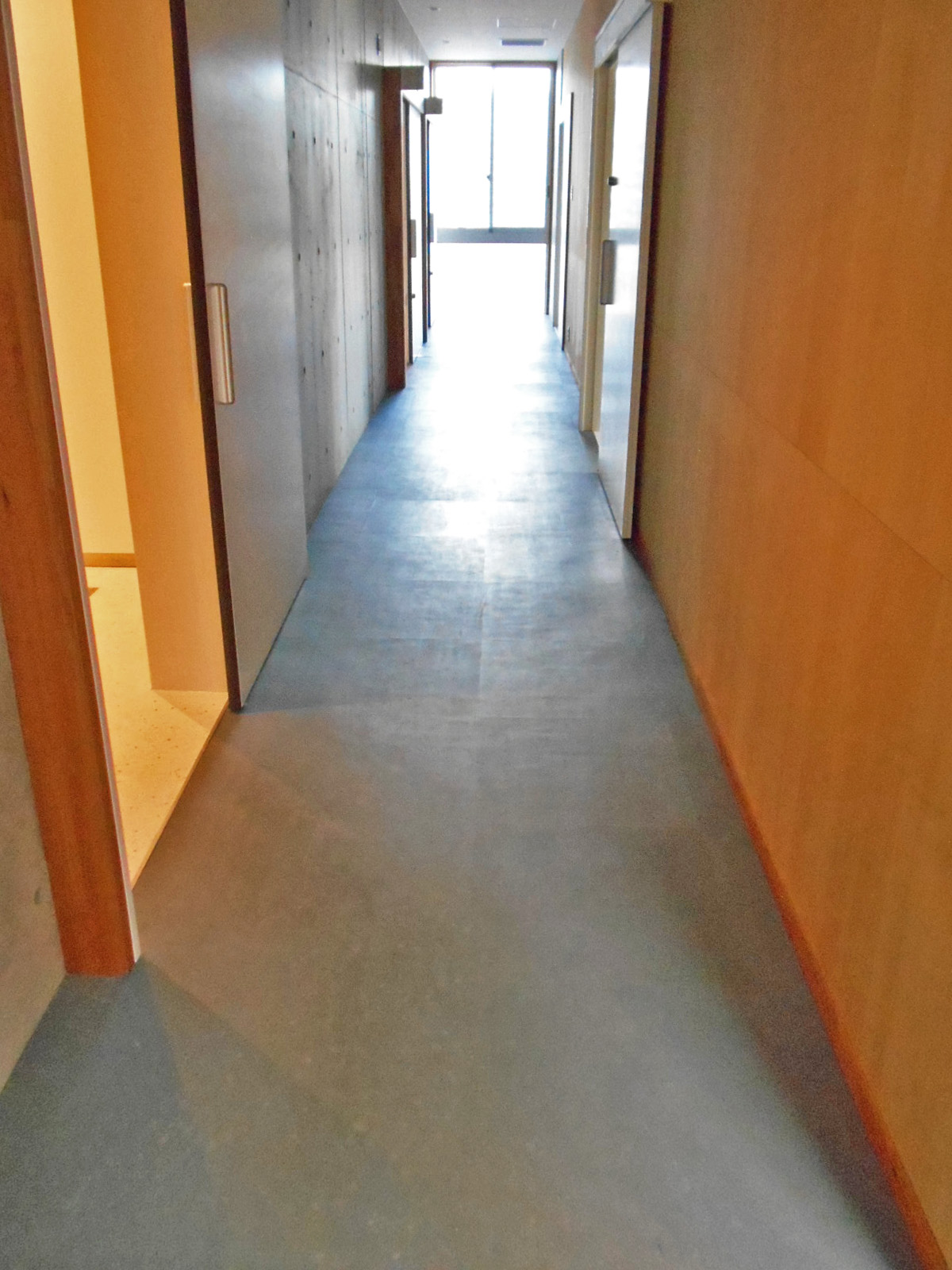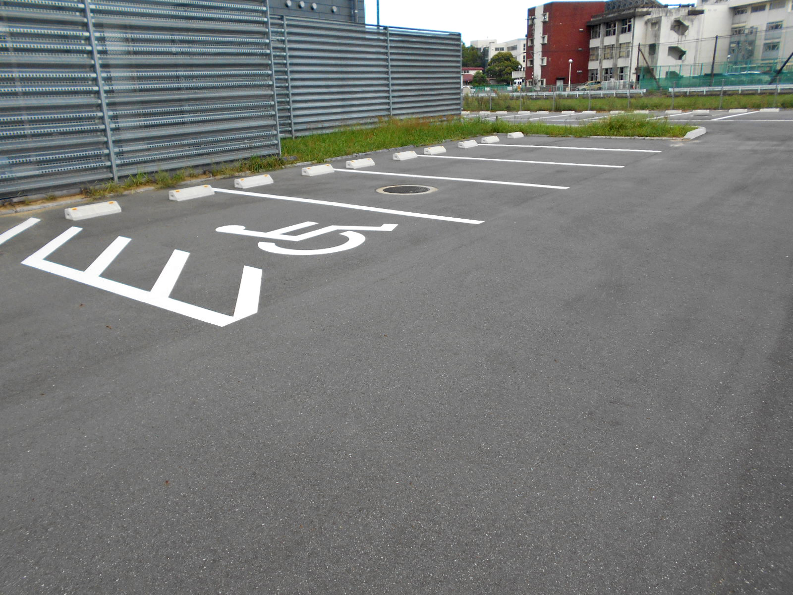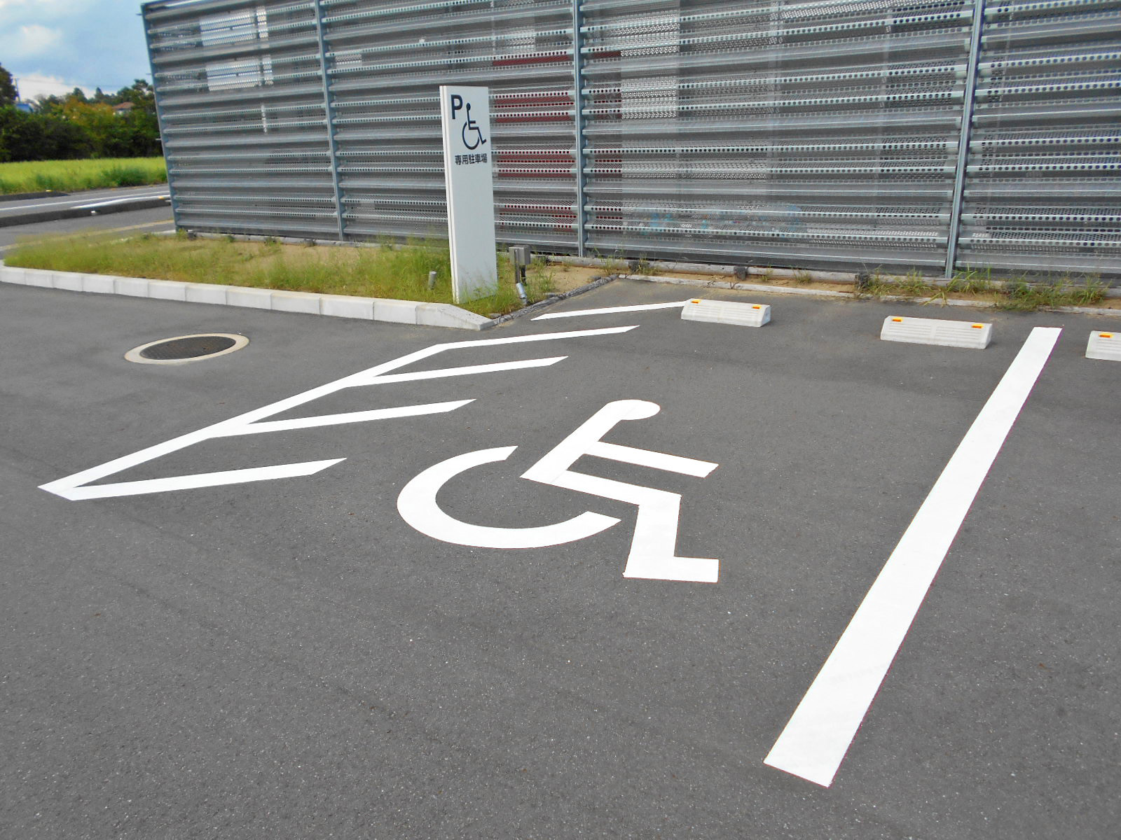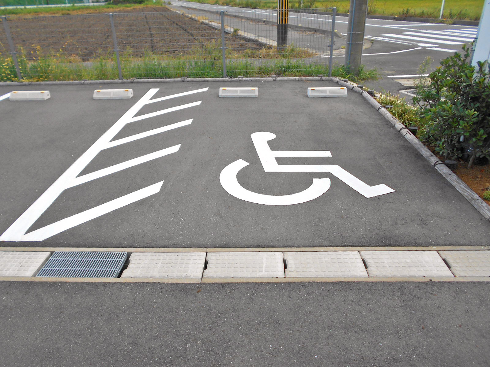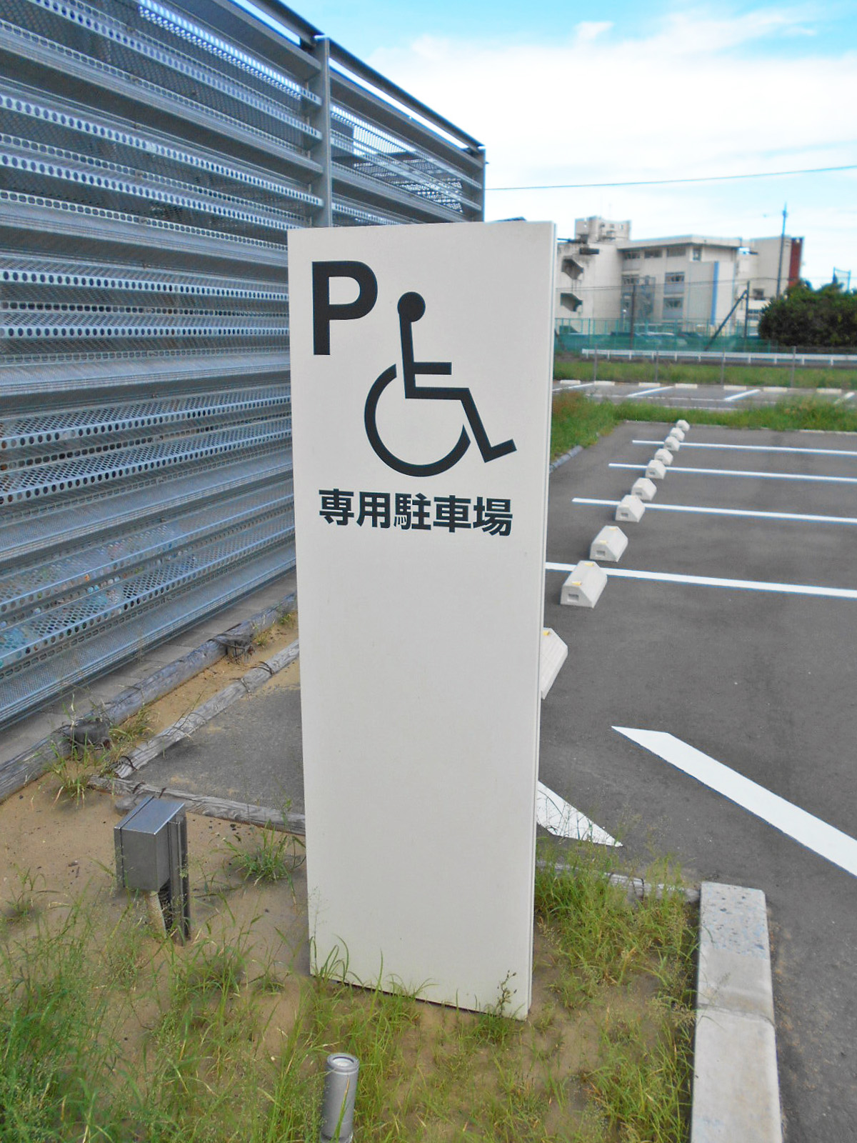 障害者等用駐車スペースの案内表示がある敷地内通路