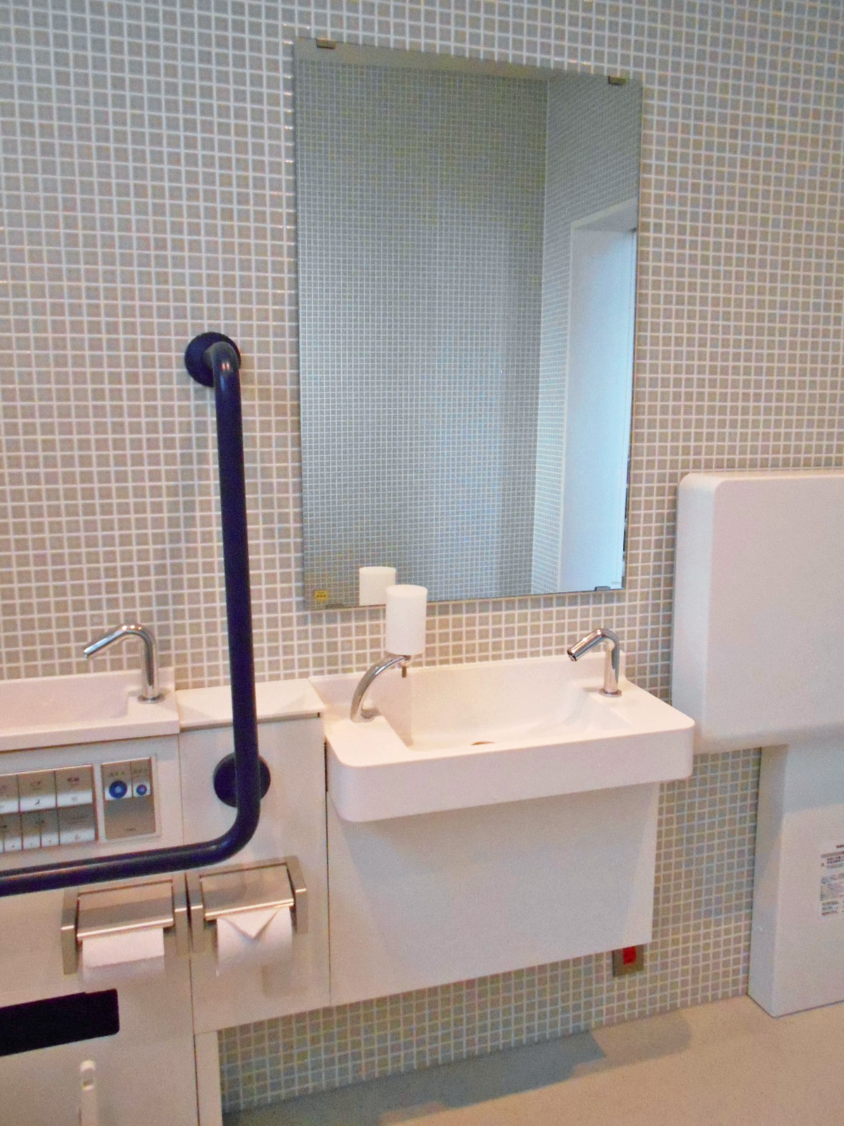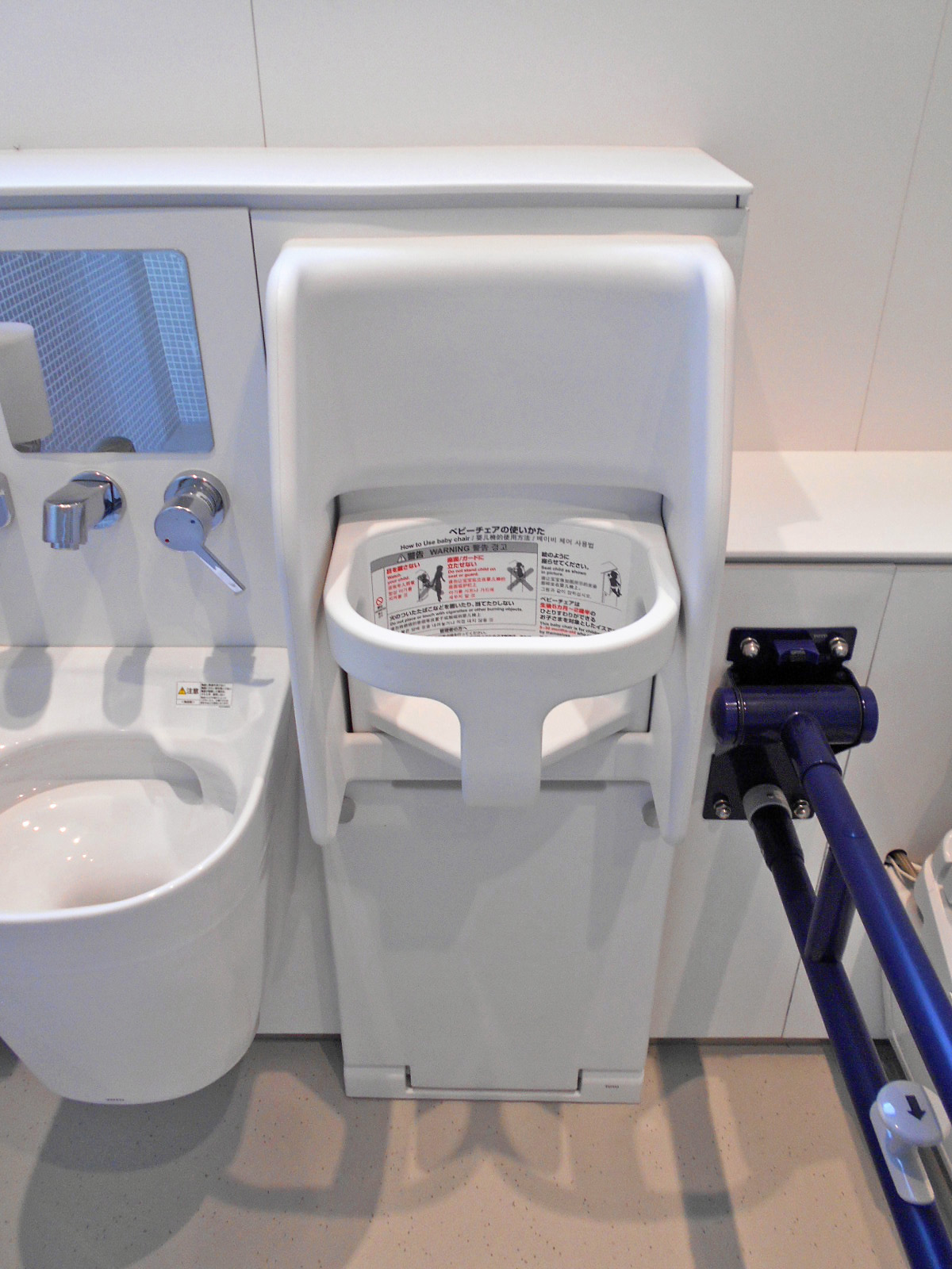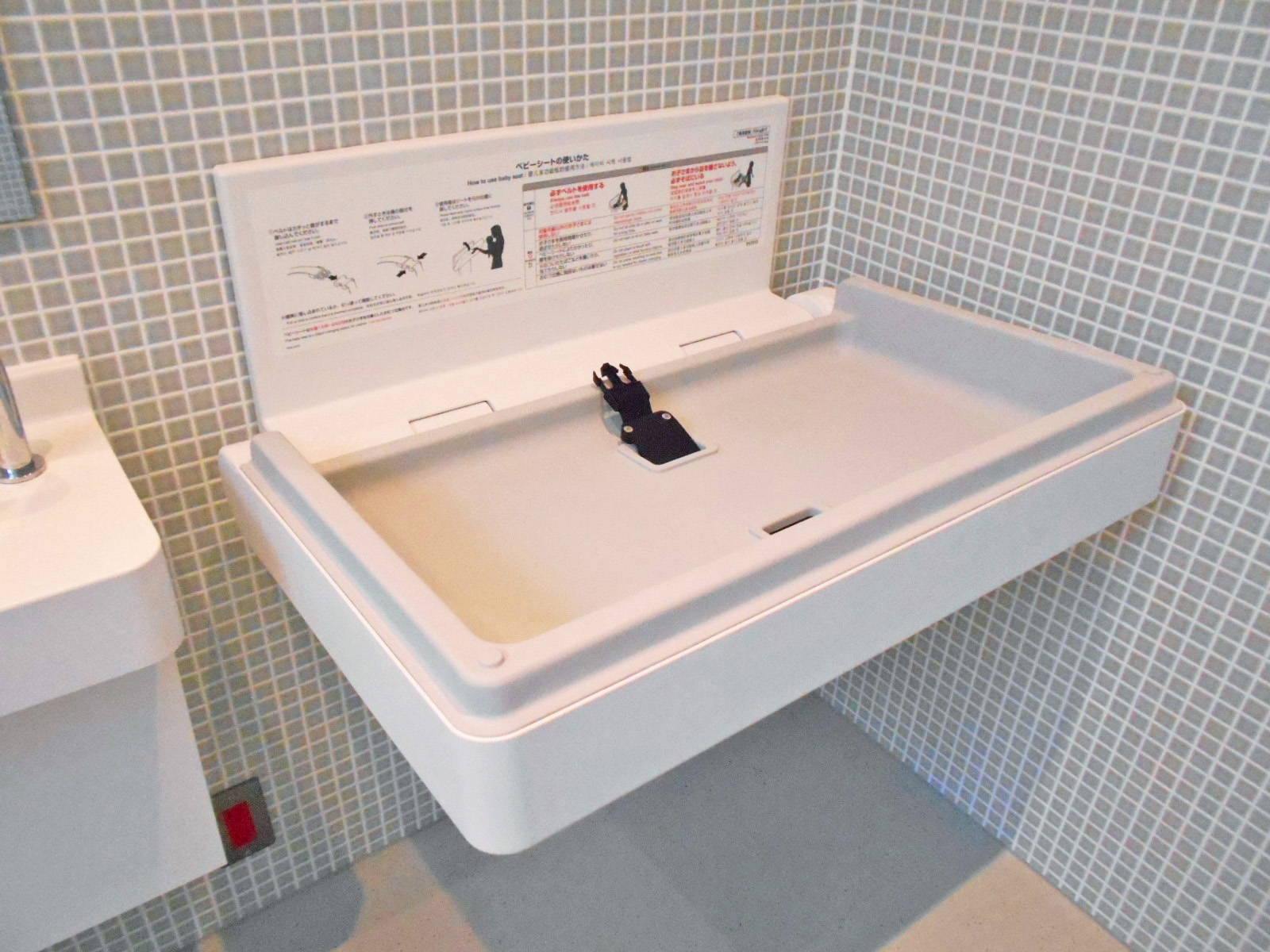 - 多目的トイレのベビーベッドはベビーシートで対応、フィッティングボード付きベビーチェアあり