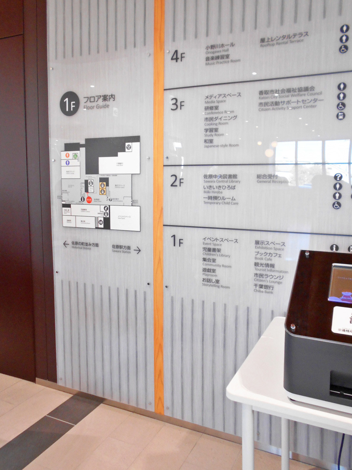 駐車場、敷地内通路、建物出入口、室内誘導、トイレ、昇降設備は香取市立佐原中央図書館、小野川ホールと共用