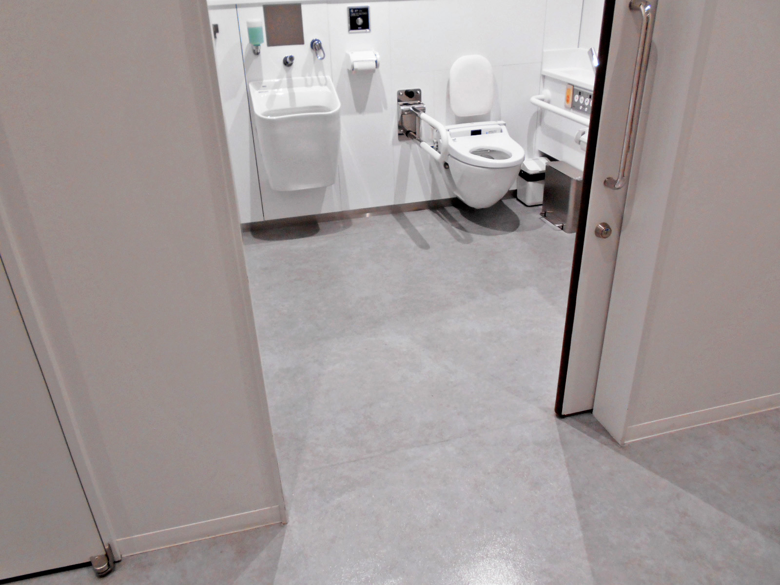- 多目的トイレの大人用ベッドは介助シートで対応、音声ガイダンス、ベビーチェアあり、一般用トイレにおむつ交換台、ベビーチェア、子供用トイレあり、洋式便器(手すり付)は右側もあり