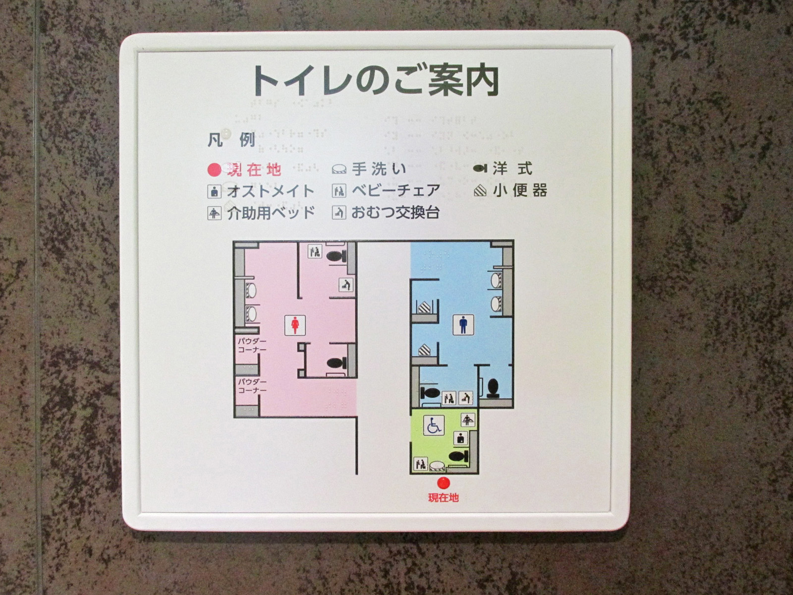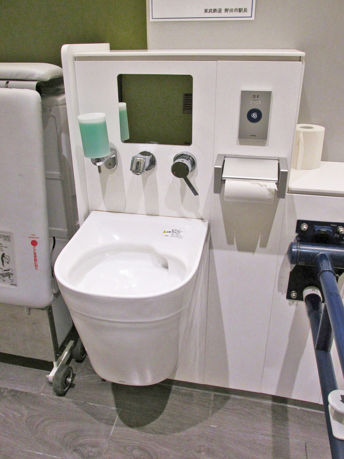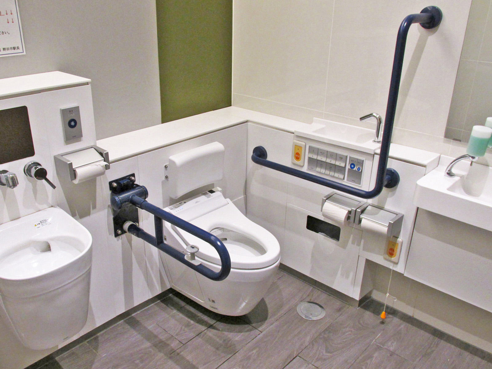- 男性用・女性用多目的トイレにはパウチしびん洗浄水栓使用型オストメイト対応設備設置あり、男女共用多目的トイレの手すりは左壁-左手すり固定右手すり可動、男性用多目的トイレの手すりは女性用多目的トイレと同様に設置あり、男女共用多目的トイレの大人用ベッドは介助用ベッドで対応、男性用・女性用多目的トイレのベビーベッドはベビーシートで対応、男女共用多目的トイレに自動開閉ボタン・音声案内あり