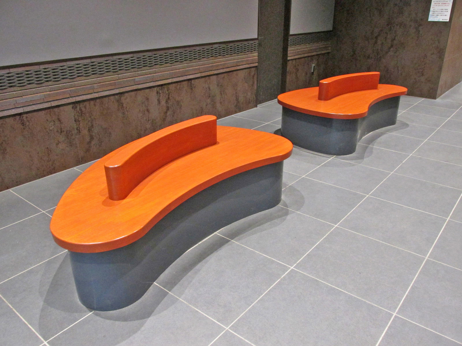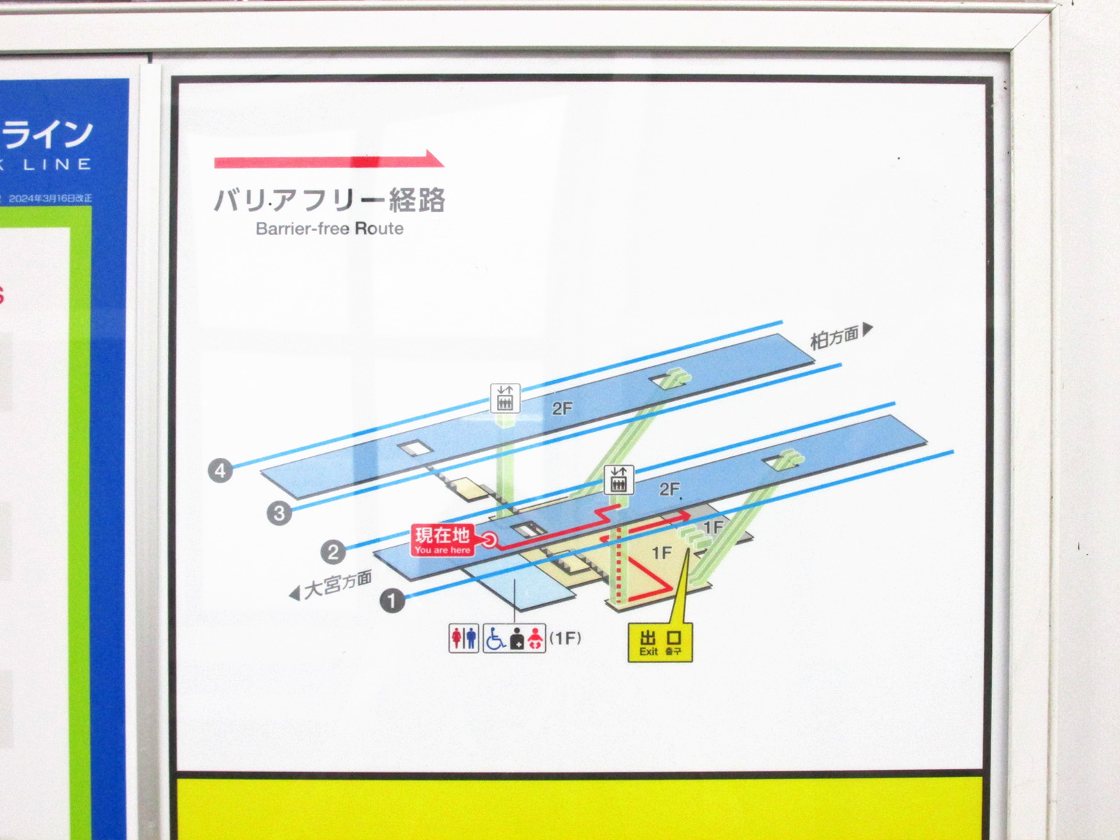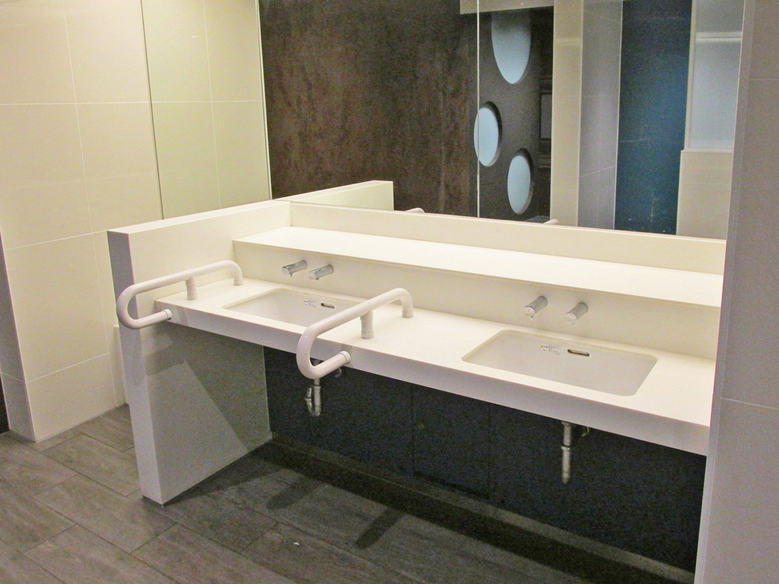 - 男性用・女性用多目的トイレにはパウチしびん洗浄水栓使用型オストメイト対応設備設置あり、男女共用多目的トイレの手すりは左壁-左手すり固定右手すり可動、男性用多目的トイレの手すりは女性用多目的トイレと同様に設置あり、男女共用多目的トイレの大人用ベッドは介助用ベッドで対応、男性用・女性用多目的トイレのベビーベッドはベビーシートで対応、男女共用多目的トイレに自動開閉ボタン・音声案内あり
