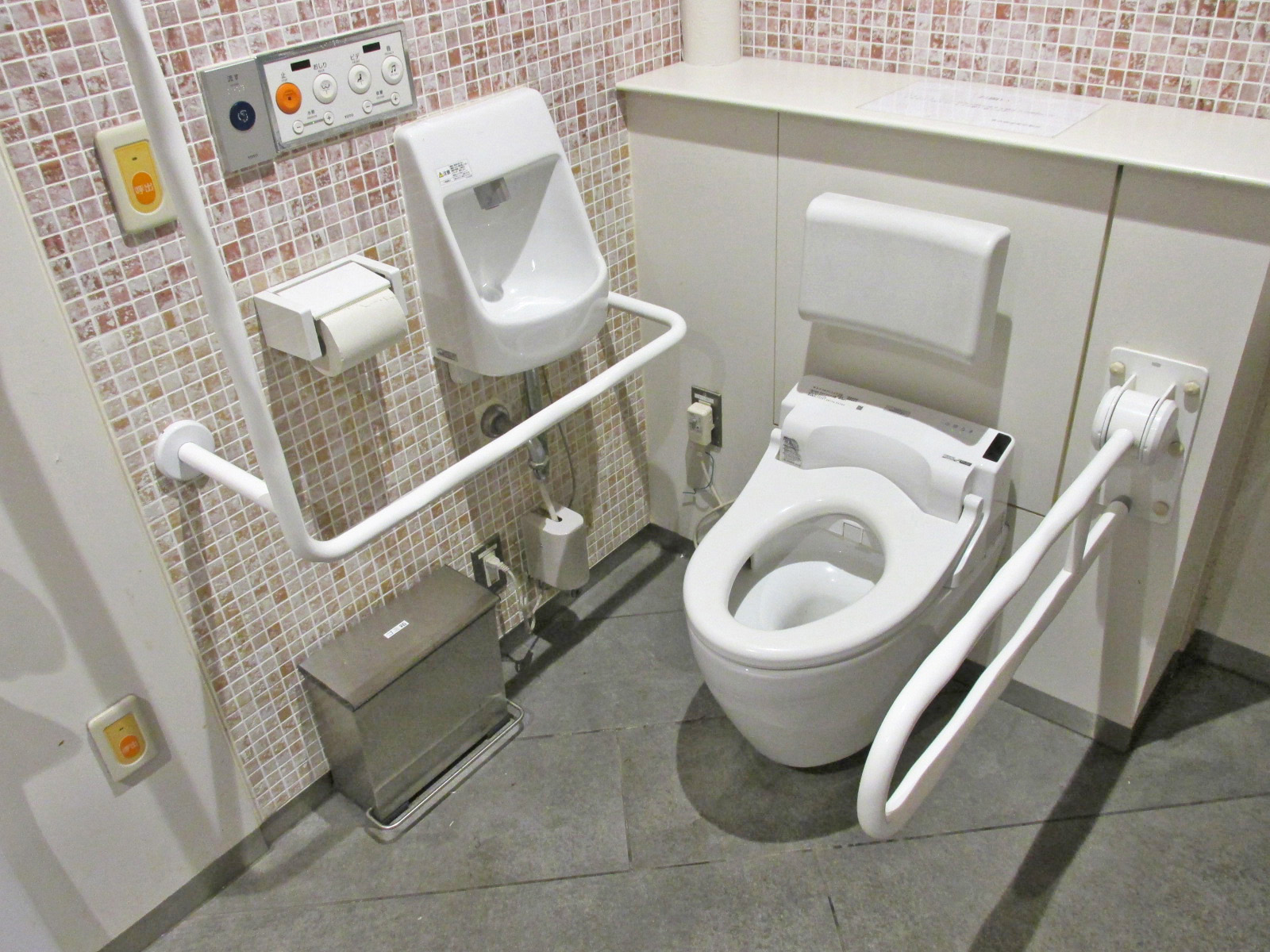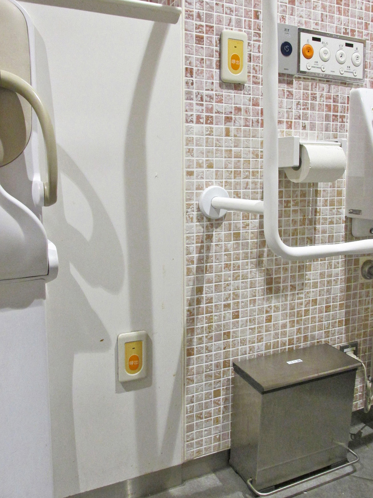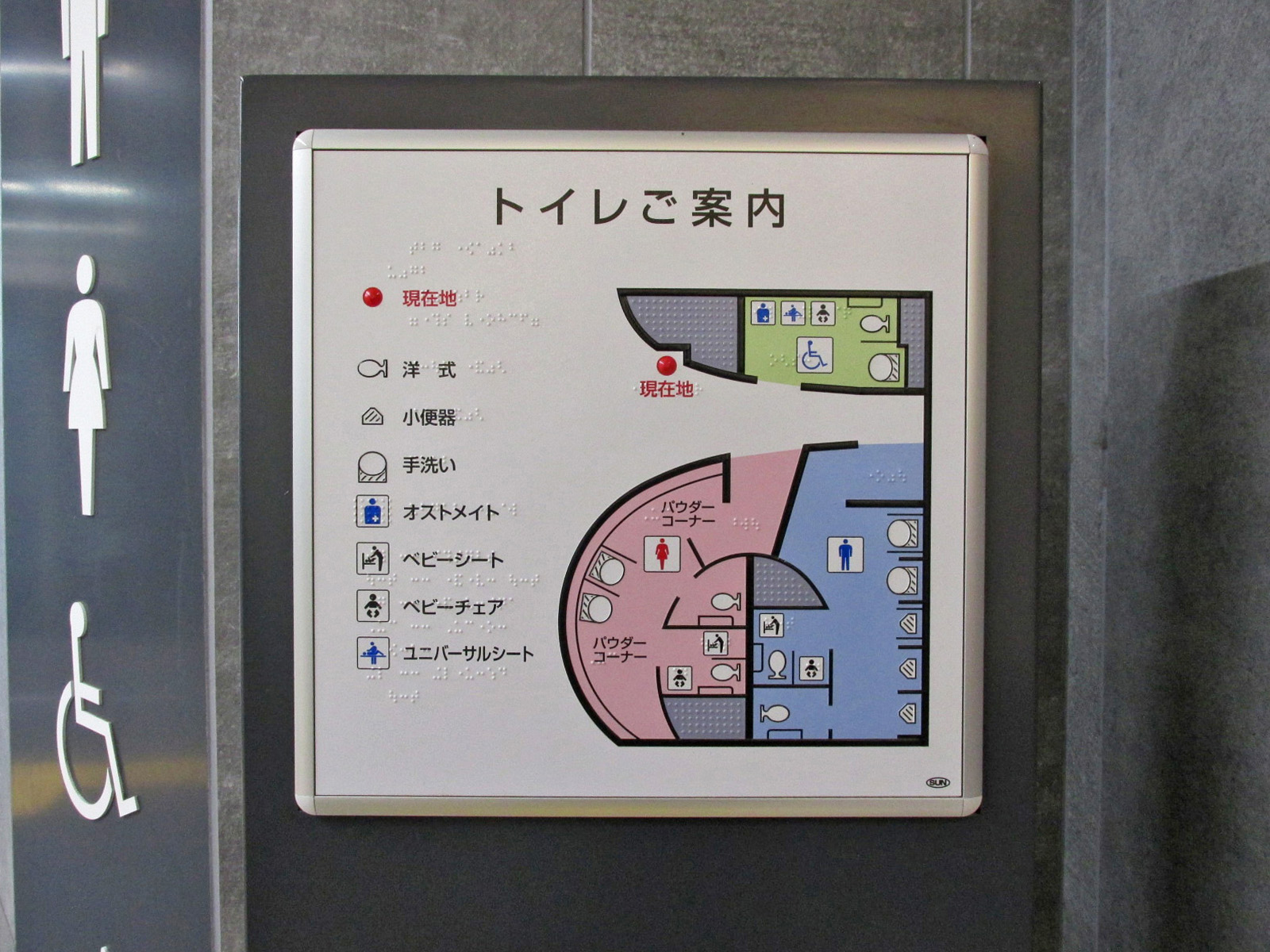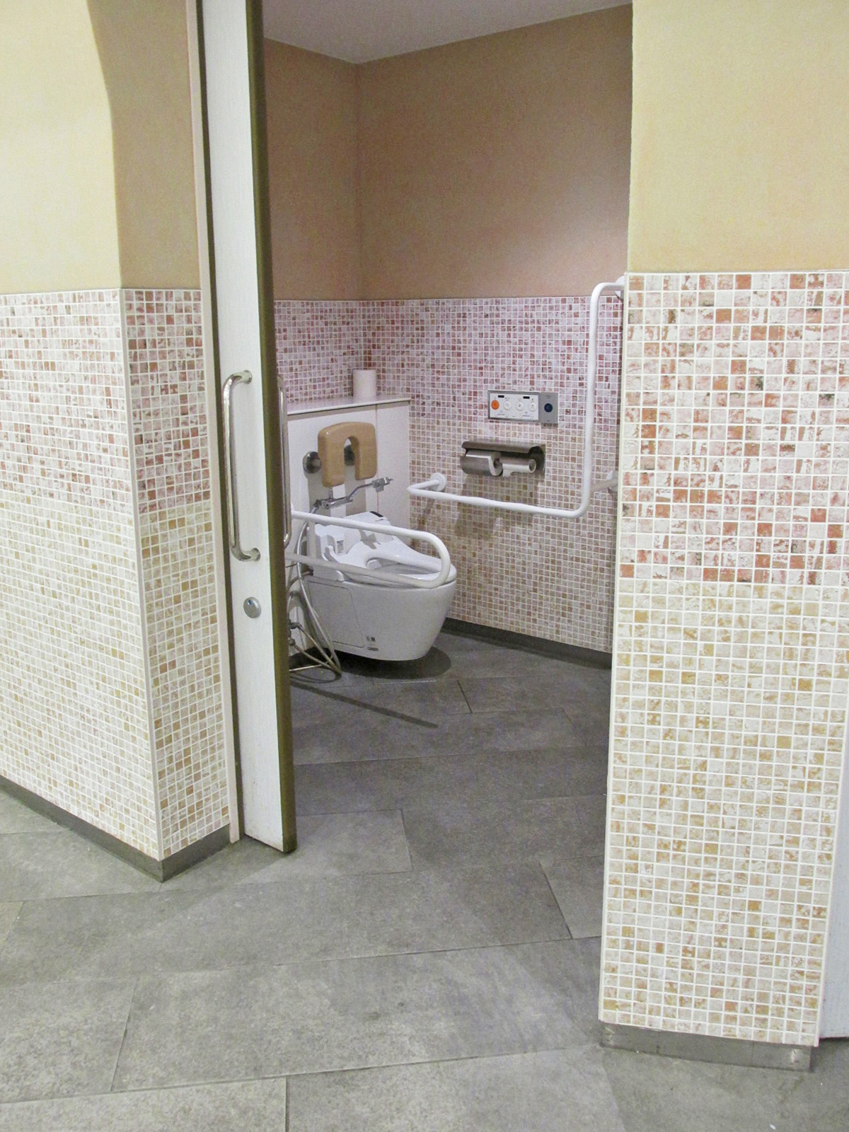 - 男性用・女性用多目的トイレにはパウチしびん洗浄水栓使用型オストメイト対応設備設置あり、男女共用多目的トイレの手すりは右壁-右手すり固定左手すり可動、男性用多目的トイレの手すりは女性用多目的トイレと同様に設置あり、男女共用多目的トイレの大人用ベッドは介助用ベッドで対応、男性用・女性用多目的トイレのベビーベッドはベビーシートで対応、男女共用多目的トイレに自動開閉ボタン・音声案内あり