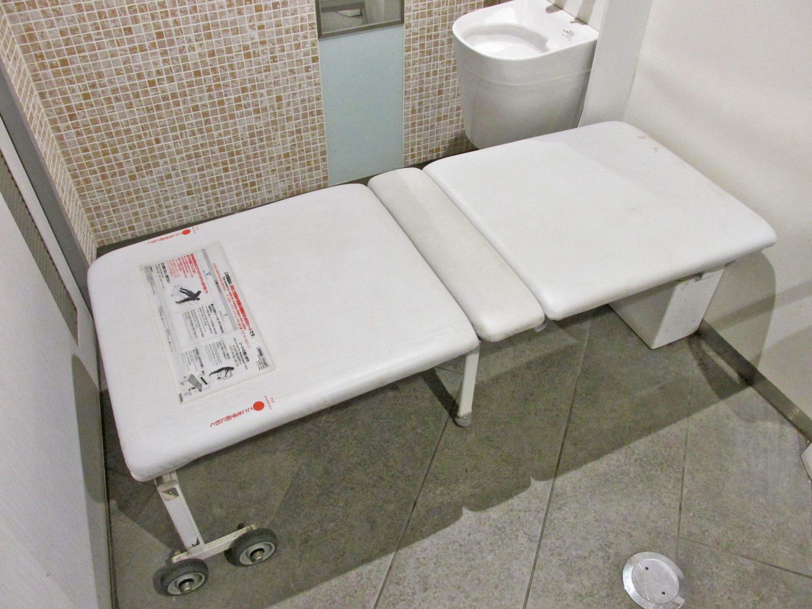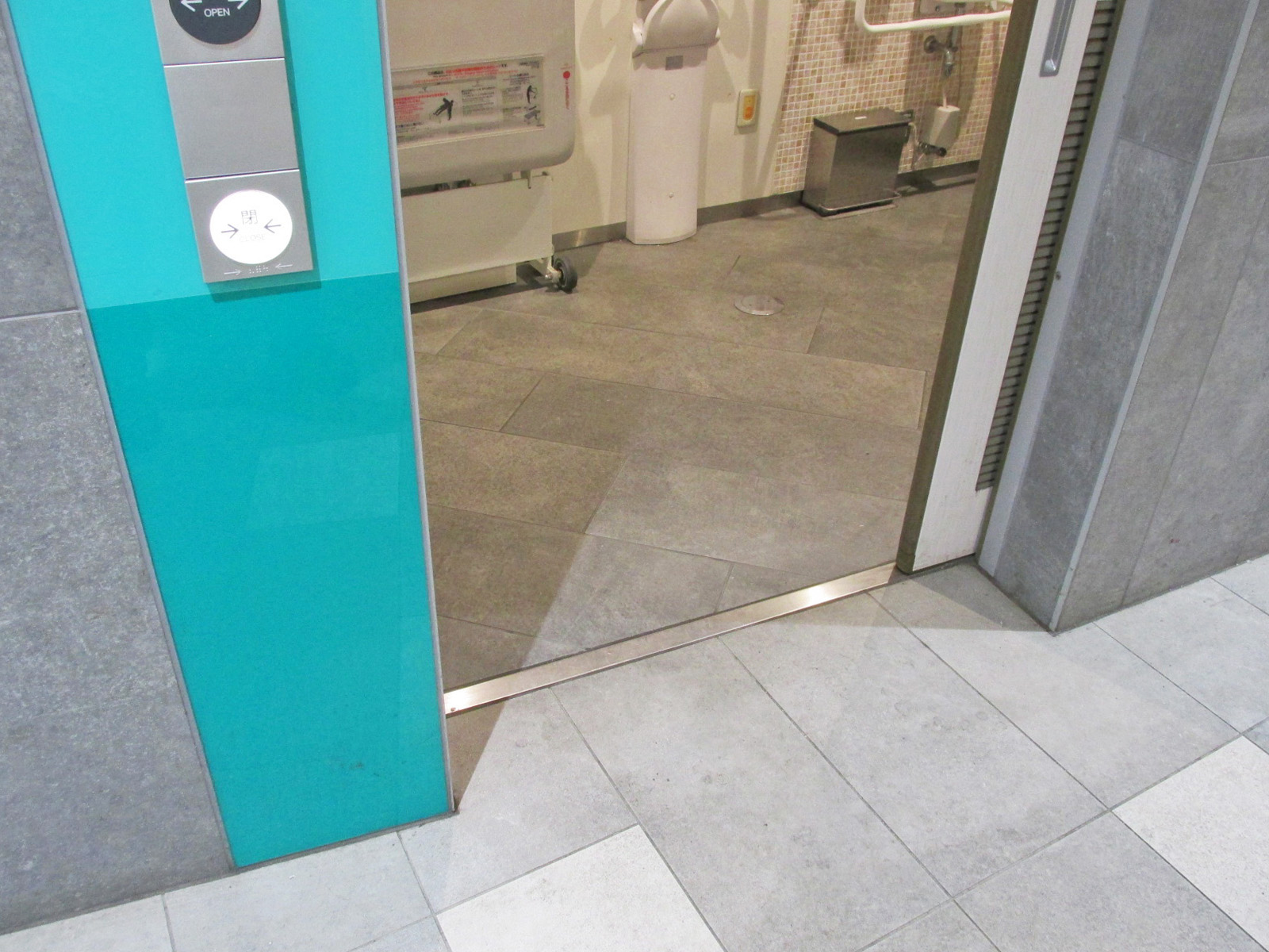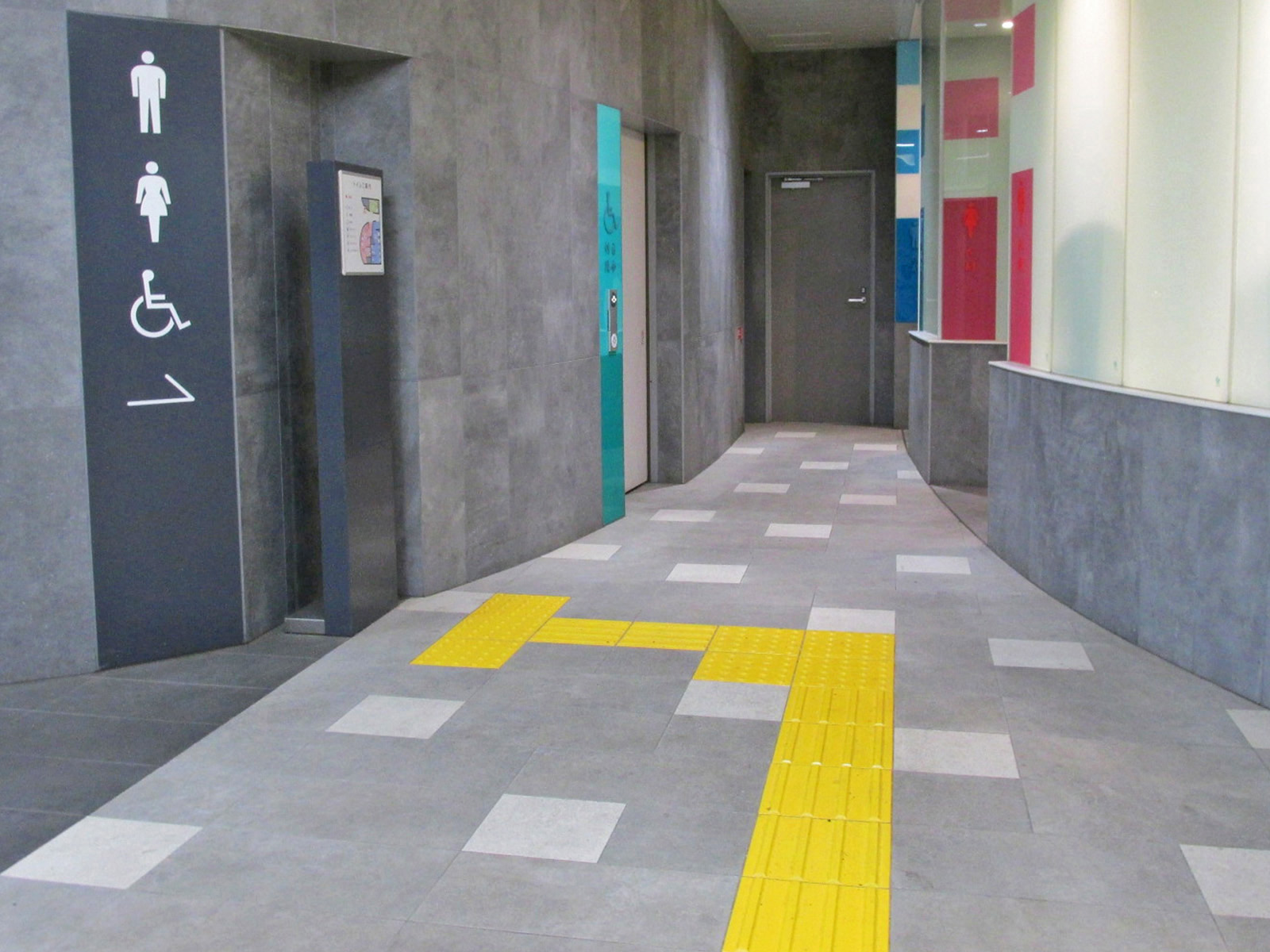 - 男性用・女性用多目的トイレにはパウチしびん洗浄水栓使用型オストメイト対応設備設置あり、男女共用多目的トイレの手すりは右壁-右手すり固定左手すり可動、男性用多目的トイレの手すりは女性用多目的トイレと同様に設置あり、男女共用多目的トイレの大人用ベッドは介助用ベッドで対応、男性用・女性用多目的トイレのベビーベッドはベビーシートで対応、男女共用多目的トイレに自動開閉ボタン・音声案内あり